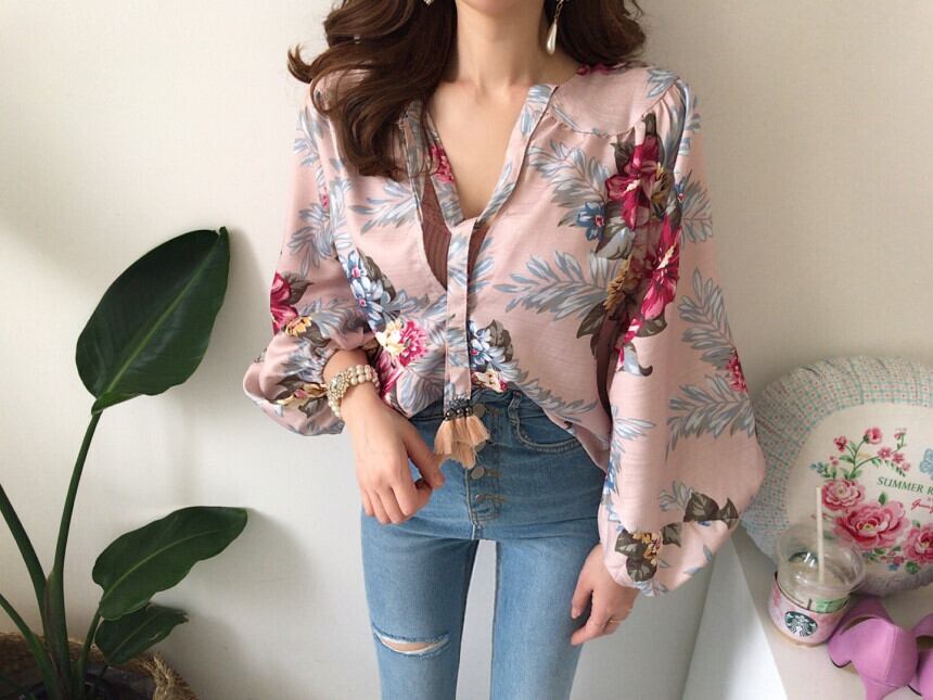 夏のニュースタイルシックなウエスタンフラワーブラウスレトロVネックネクタイは薄手のデザインセンスランタンスリーブシャツ 韓国婦人4685101949