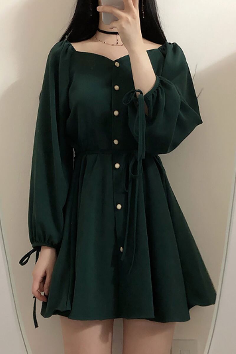 シックなレトロな冷風スクエアカラーストラップレスシングルブレストウエストショートスモールパフスリーブドレス女性 韓国婦人17709701723