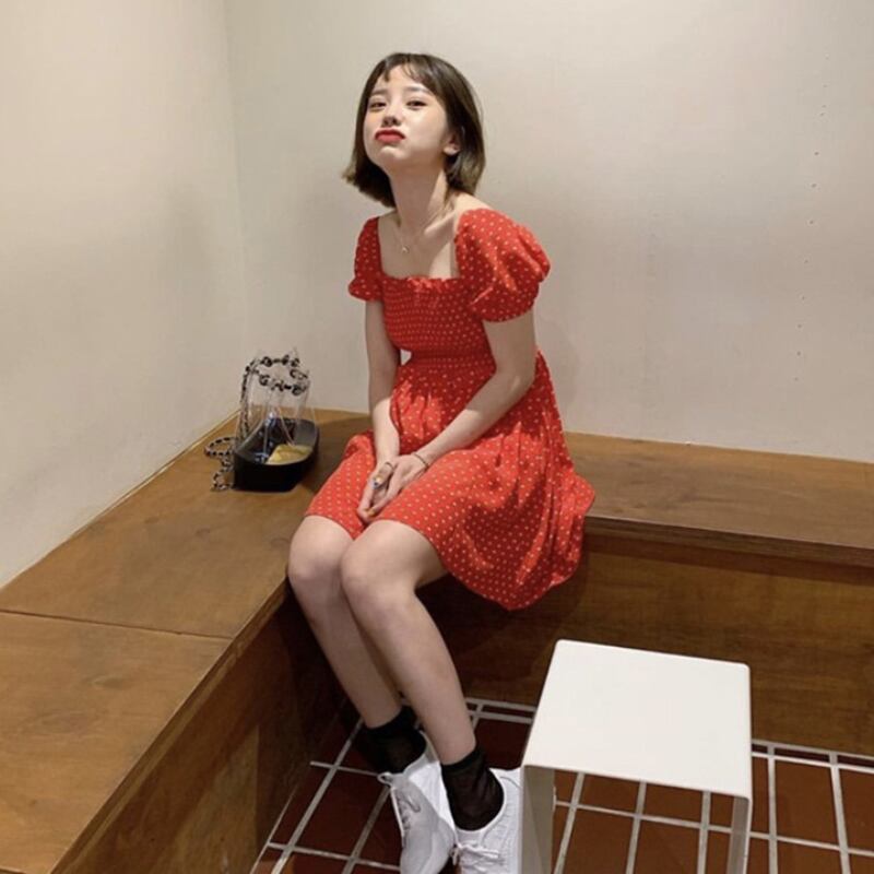 シックな年齢を減らす遊び心のあるウェーブポイントホワイトスクエアカラースリムウエストスモールパフスリーブドレス、木製の耳付き 韓国婦人2723494291