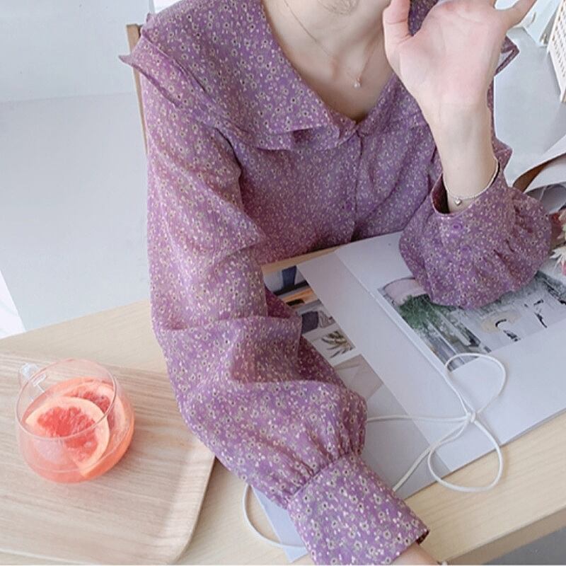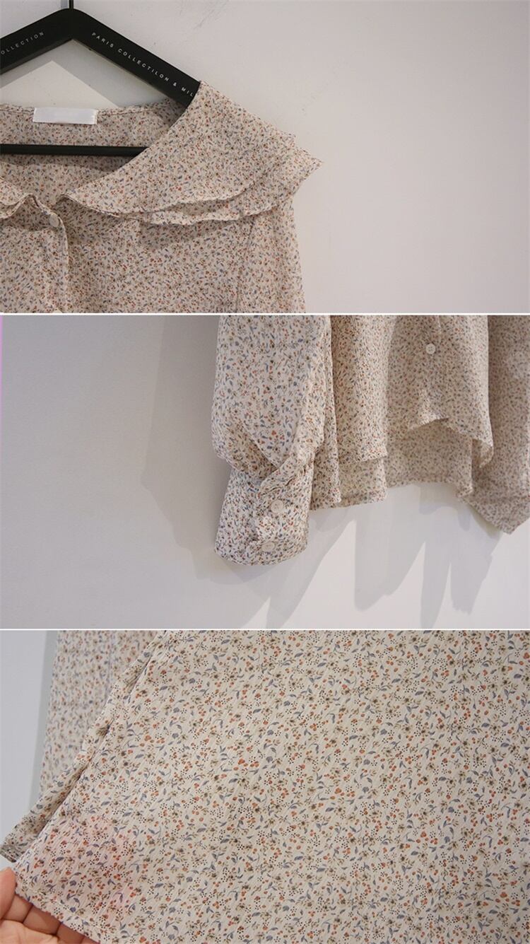サウスインネットレッド甘くてかわいい二層フリル襟妖精小花柄シャツ長袖シフォンシャツ女性 韓国婦人85502861760