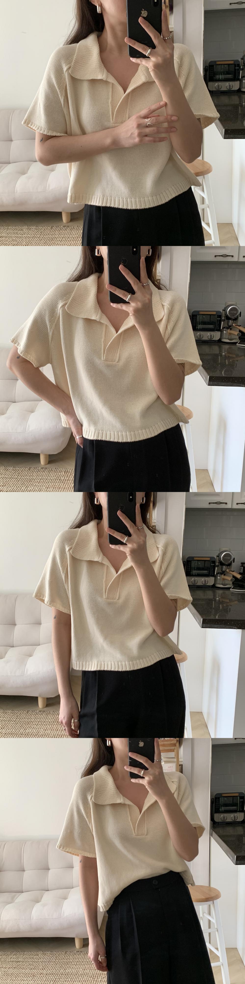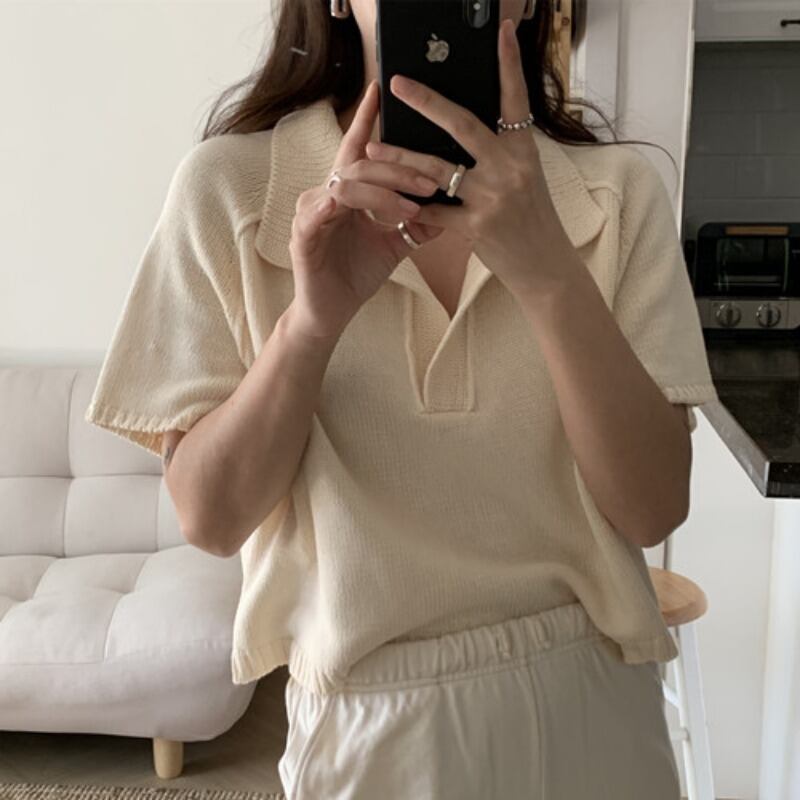 シックな春のレトロシンプル優しいクリームラペルルーズショートニット半袖Tシャツトップ 韓国婦人43552170358