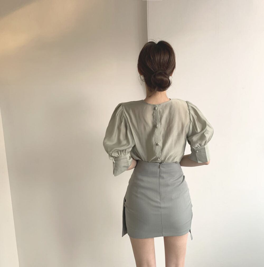 色:緑のシャツ,白のシャツ,黒スカート,グレーブルーのスカート