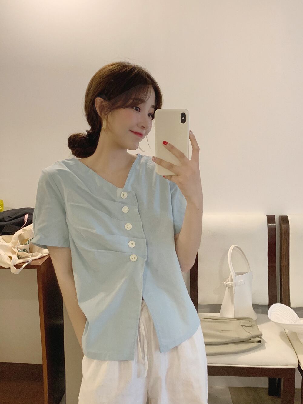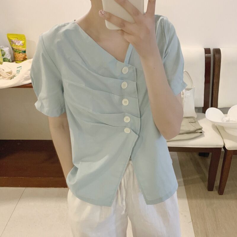 シックで優しいレトロな細いVネックプリーツ不規則なシングルブレスト無地無地ルーズ半袖シャツ女性夏 韓国婦人75466904890