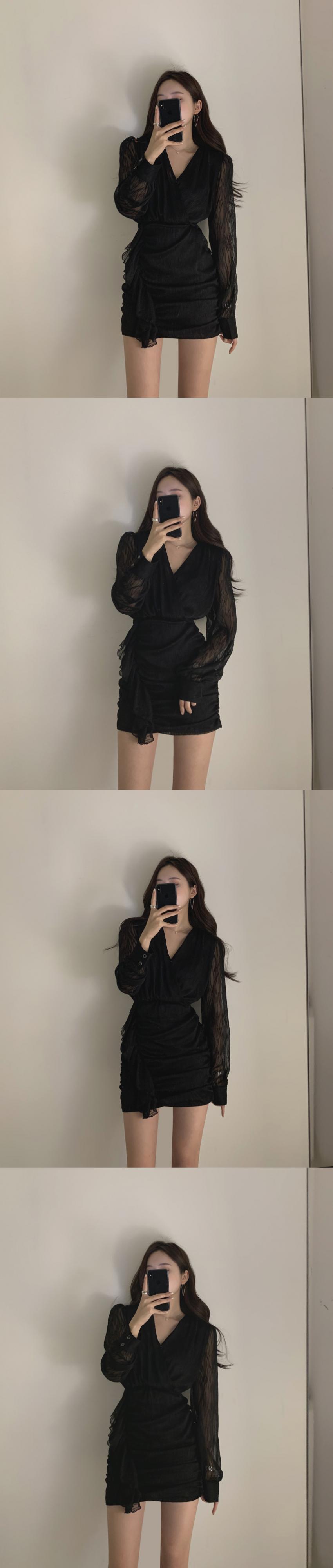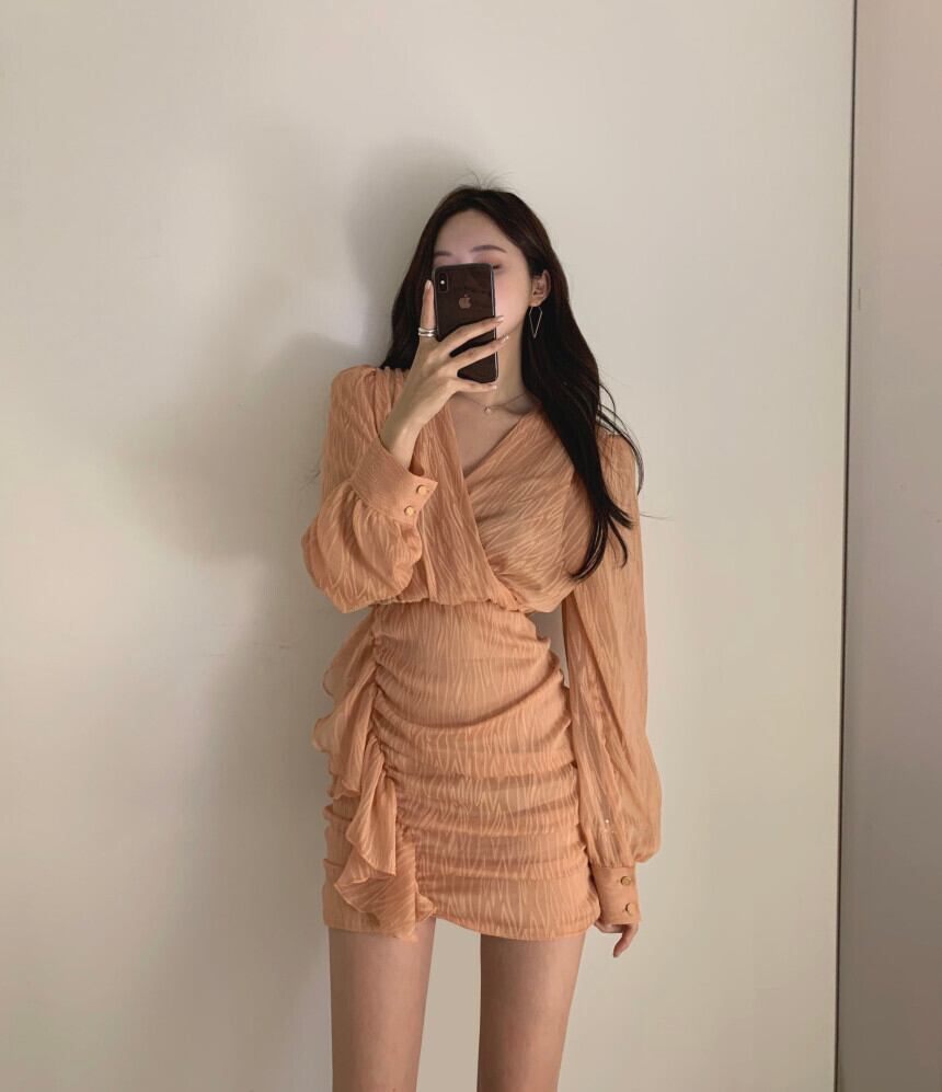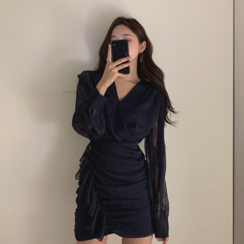 シックなフレンチエレガントなVネッククロスウエストスリミングリンクルステッチフリルヒップドレススカート 韓国婦人36406638133