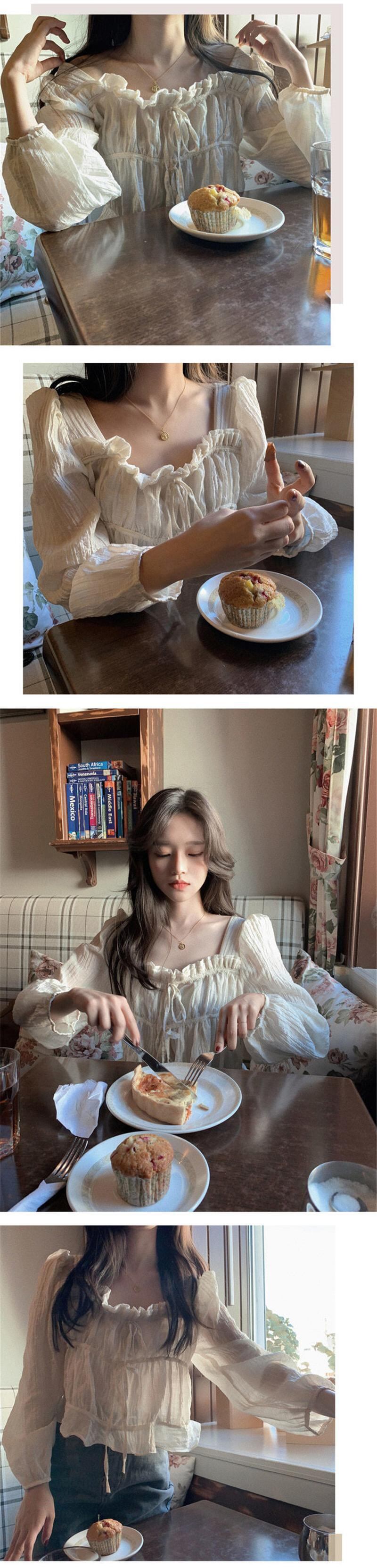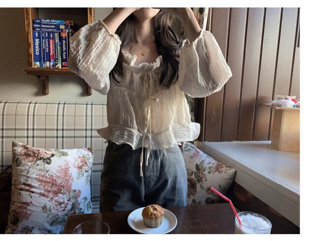 2020年春のシックな甘くて年齢を減らす菌のスクエアネックドローストリングプリーツ長袖シャツブラウス 韓国婦人78230253433