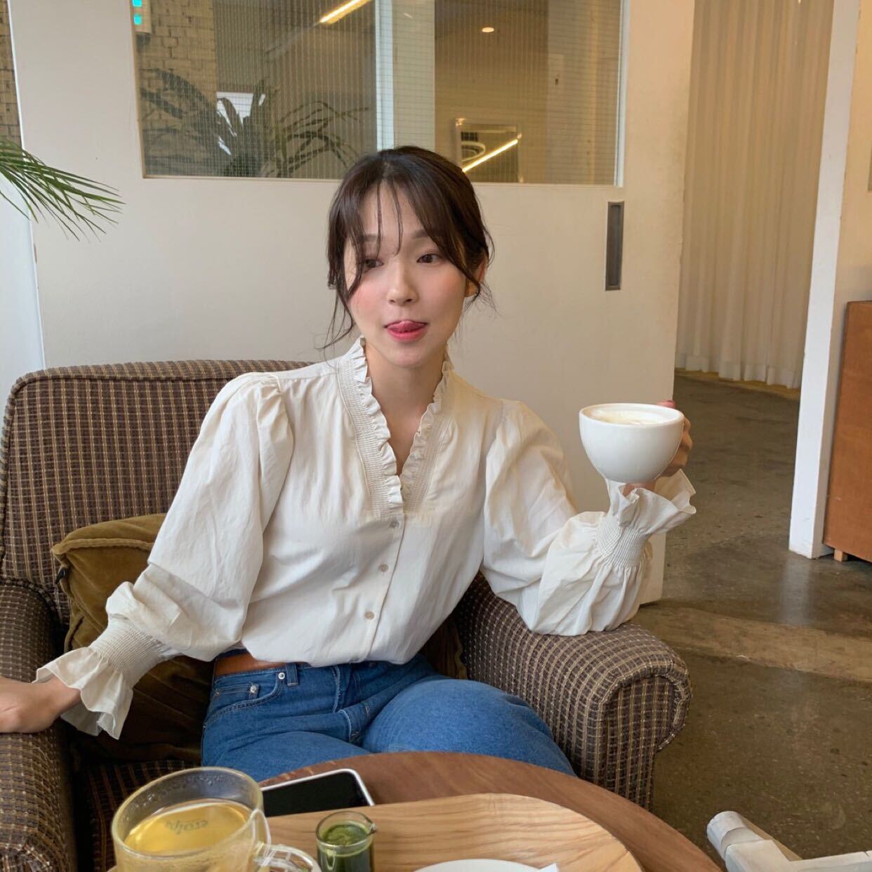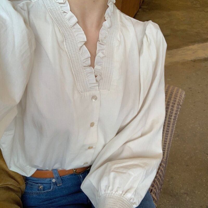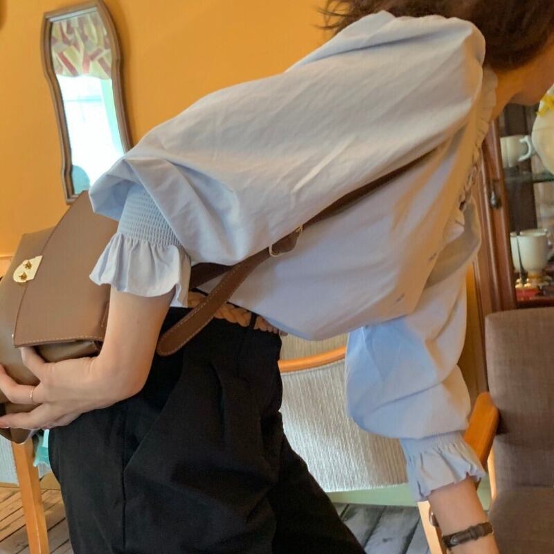 シックな春の優しいミルクソフトブルー小さなVネックキクラゲデザイン伸縮性のあるランタンスリーブシャツトップ女性 韓国婦人10784479449