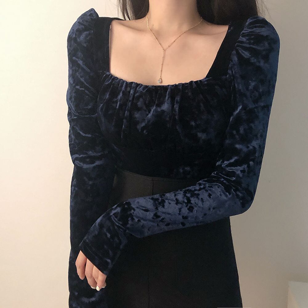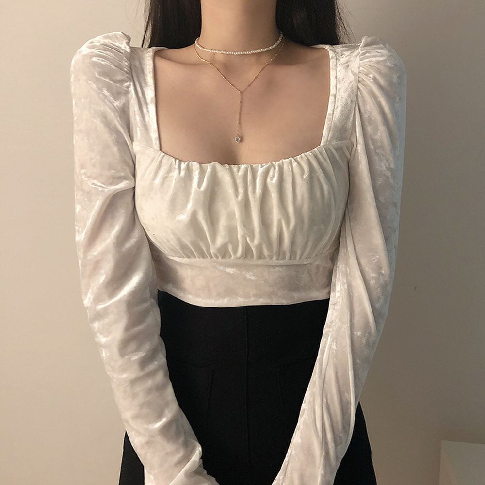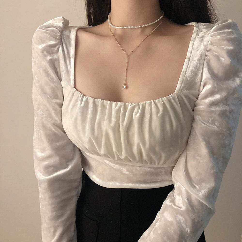 スクエアカラーベルベット長袖シャツレディース2020春シックパレススタイル薄パフスリーブトップショートトレンド 韓国婦人96854971063