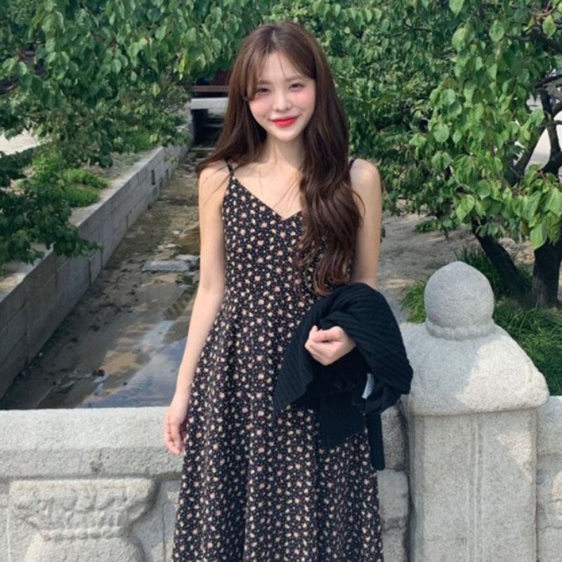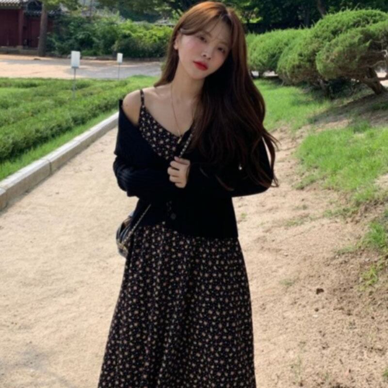 長袖ニットスモールセータートップススーツ女性春新作Vネックフローラルサスペンダースカートツーピーススーツは薄かった 韓国婦人84718502543