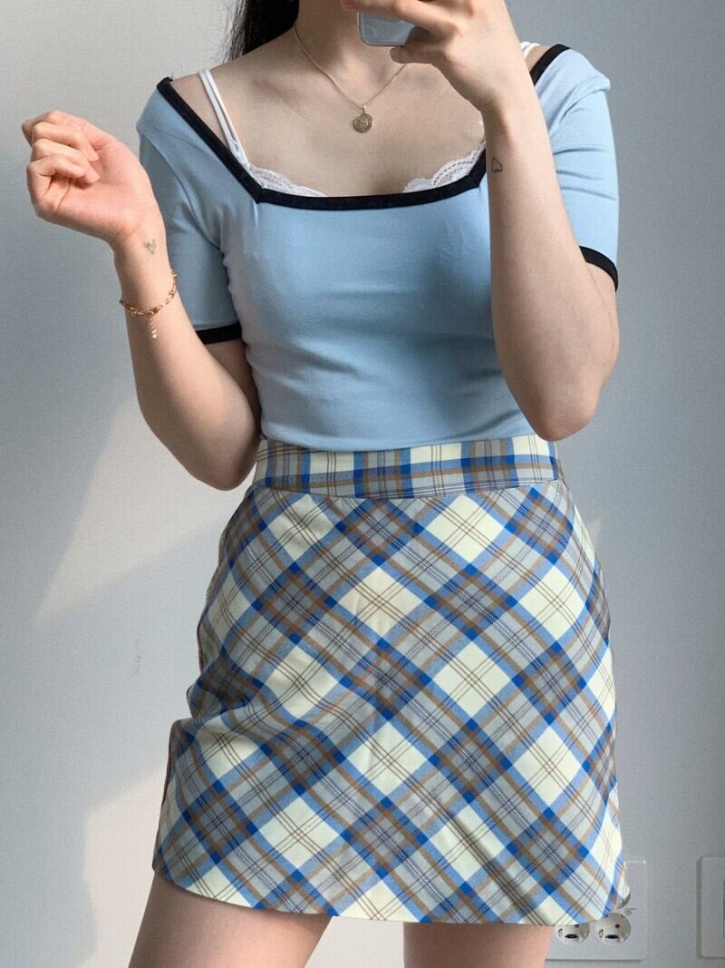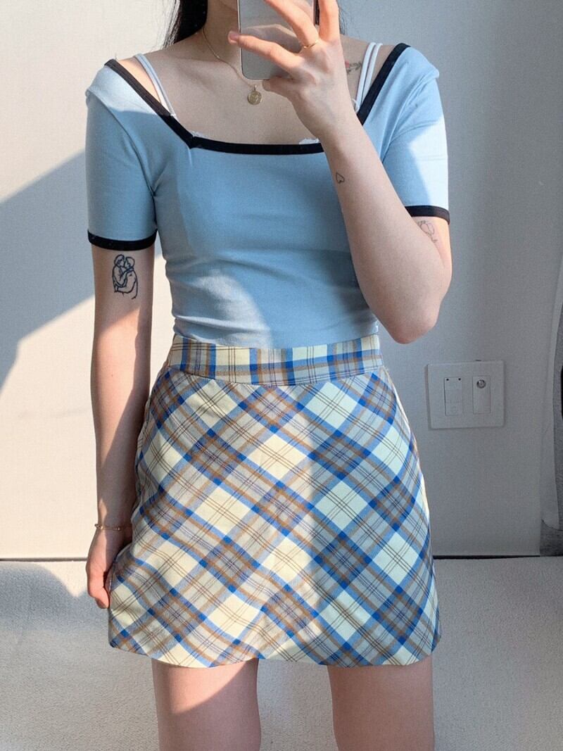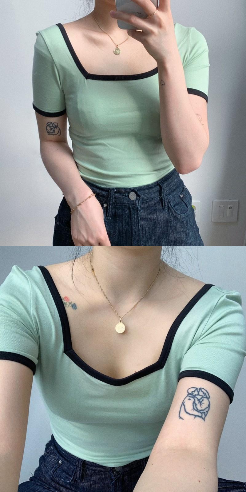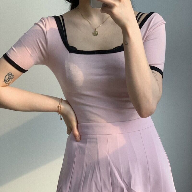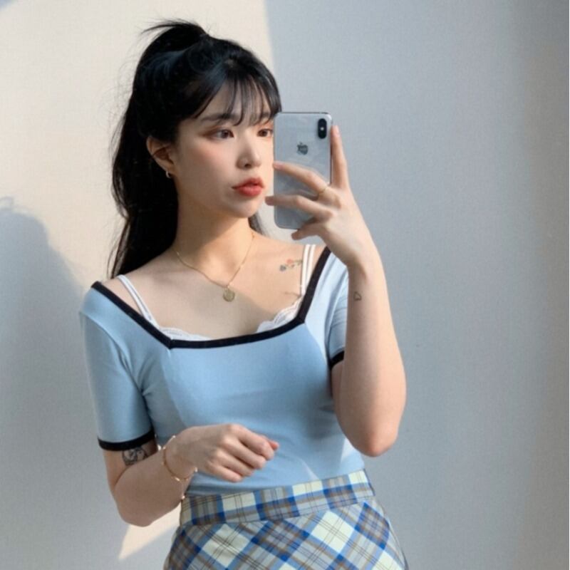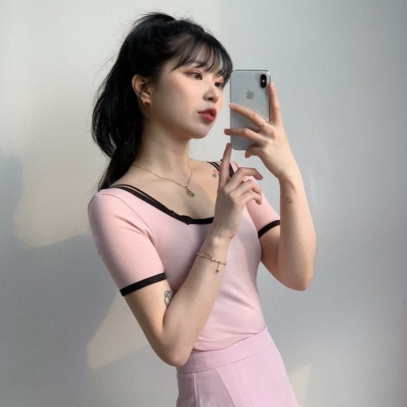 ゴーストホースサマーシックエイジリダクションサマーレトロスクエアカラースリムスリム半袖ニットトップTシャツ 韓国婦人76071119601