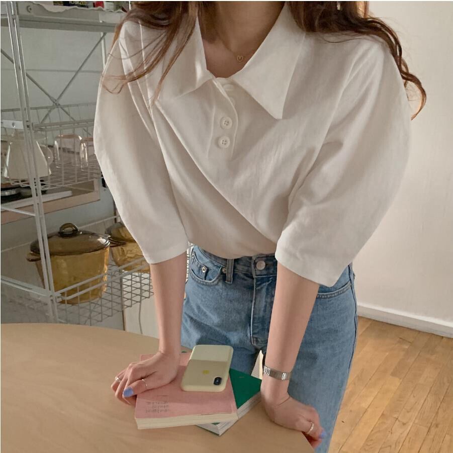 シックでシンプルで用途の広いポロカラースモールブレストルーズソリッドカラーカジュアル5点バブルスリーブTシャツトップ女性 韓国婦人10544761206