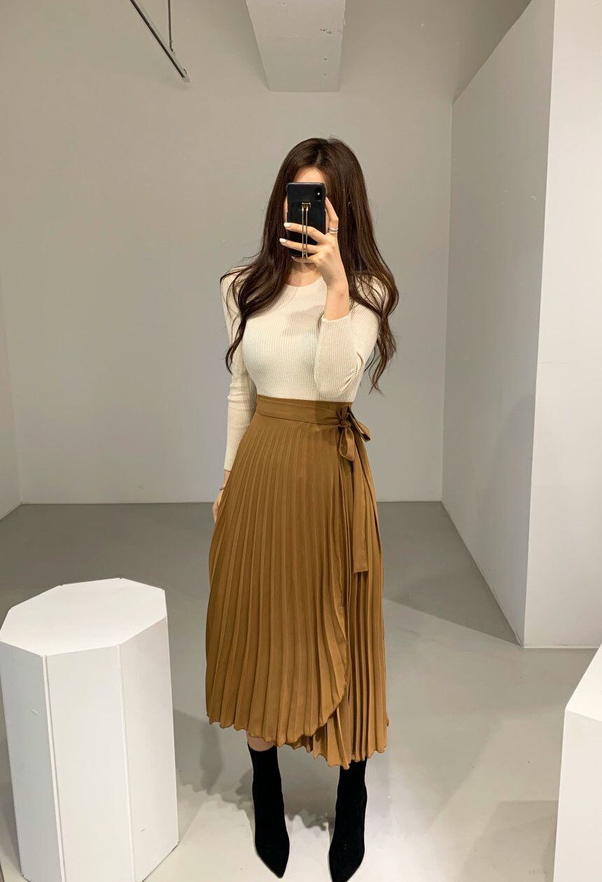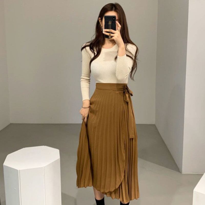 シックでエレガントなオールマッチラウンドネックスリムフィットピットストライプセーター+ハイウエストワンピースレースプリーツスカート 韓国婦人99271110614