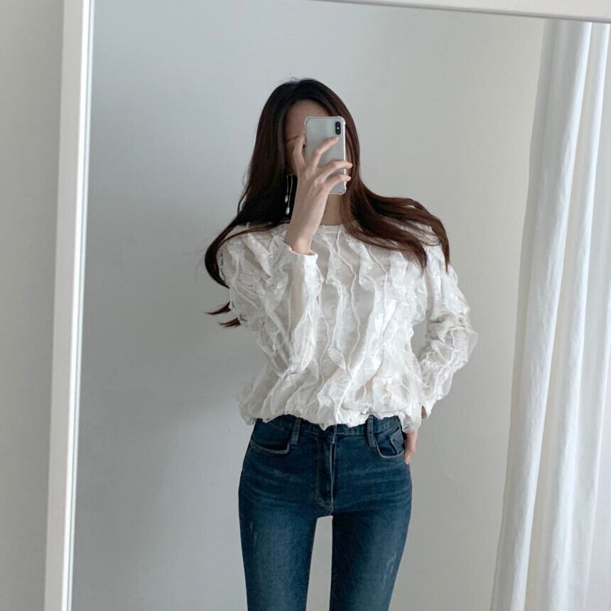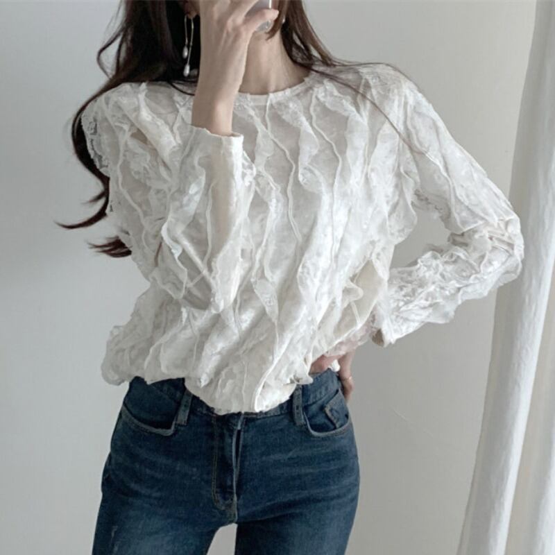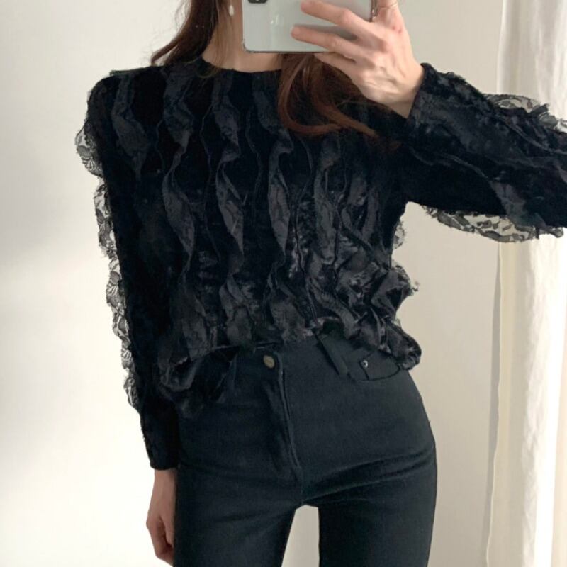 insカジュアルオールマッチブラウスフリル立体レーストップスステッチベルベットルーズ長袖シャツ 韓国婦人92817831705