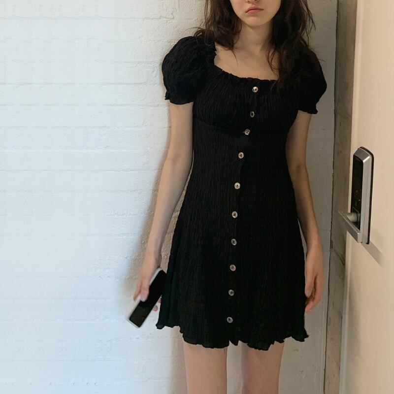 シックでロマンティックなフレンチレトロドレスエレガントなウエストシングルブレストプリーツリトルブラックスカート半袖ドレス 韓国婦人39850668706