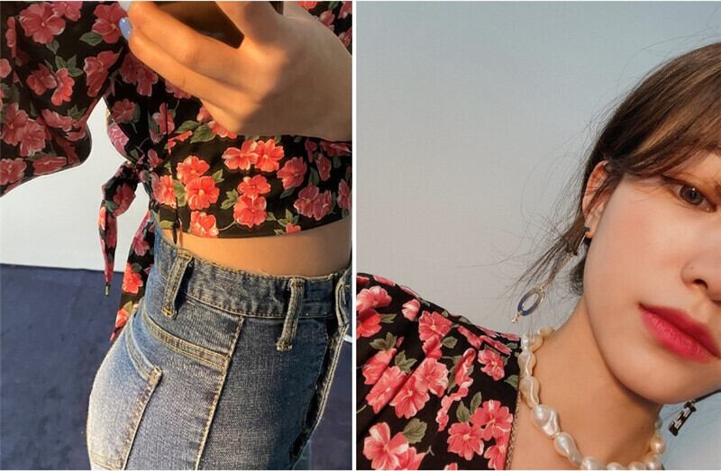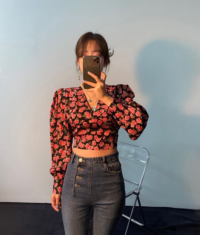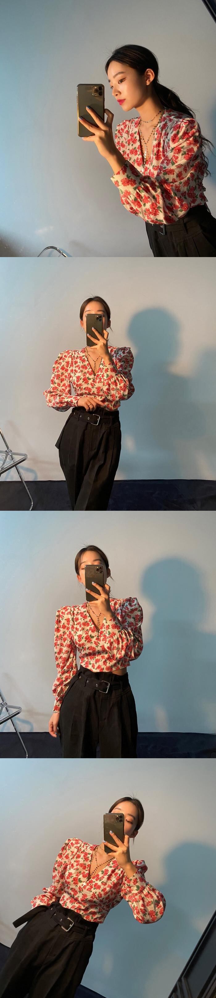 ゴーストホースシックなレトロフローラルVネックスモールセクシーショートハイウエストレースアップシンパフスリーブシャツ 韓国婦人20605235588