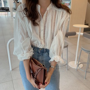 シックな気質フレンチラウンドネックシングルブレストレースフックフラワーホロー慎重に機械ルーズ長袖シャツ女性 韓国婦人93924175732