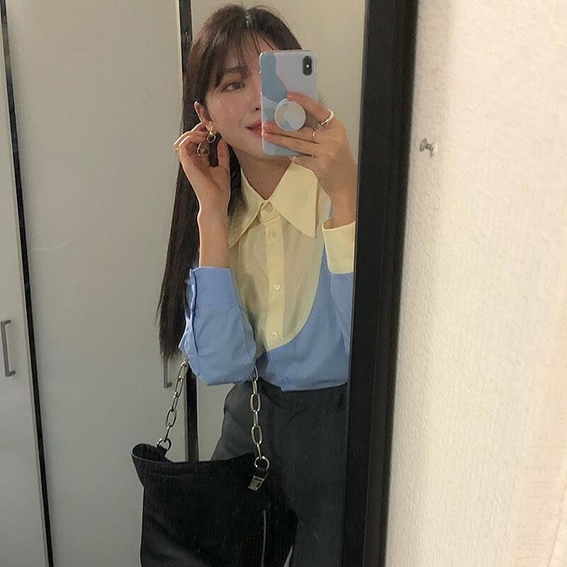 サウスシックレトロポインテッドカラーイレギュラーヒットカラーデザインシャツワイルドルーズシングルブレスト長袖シャツ女性 韓国婦人64490201023