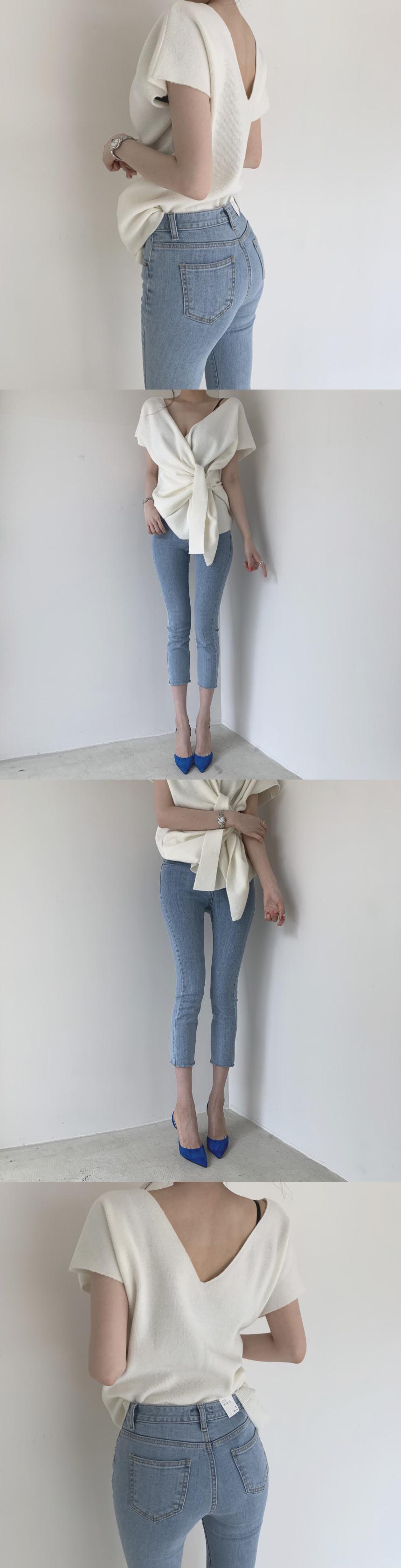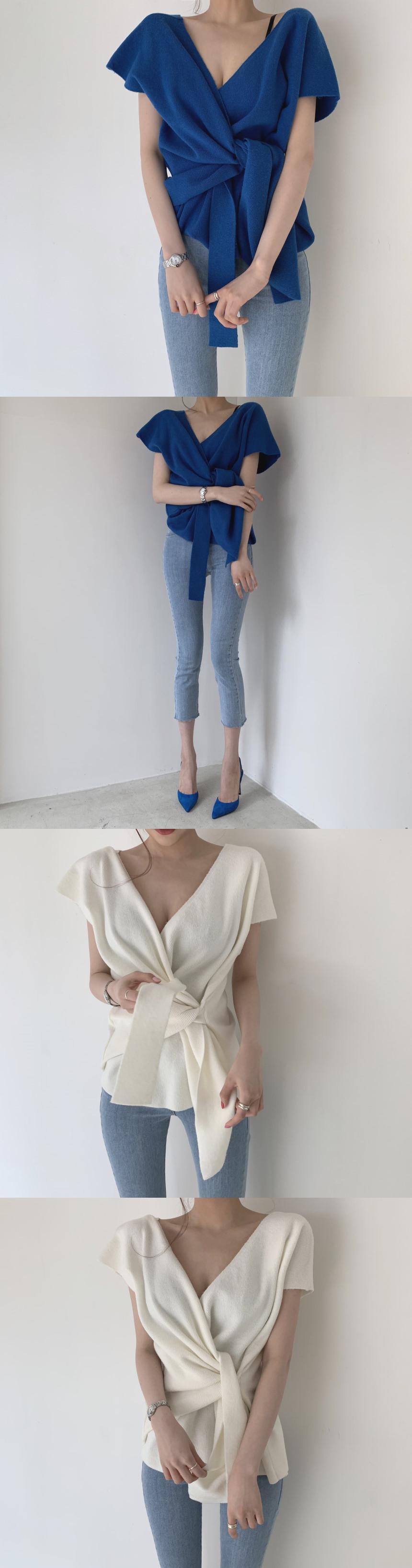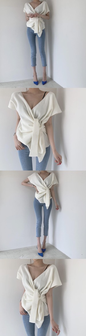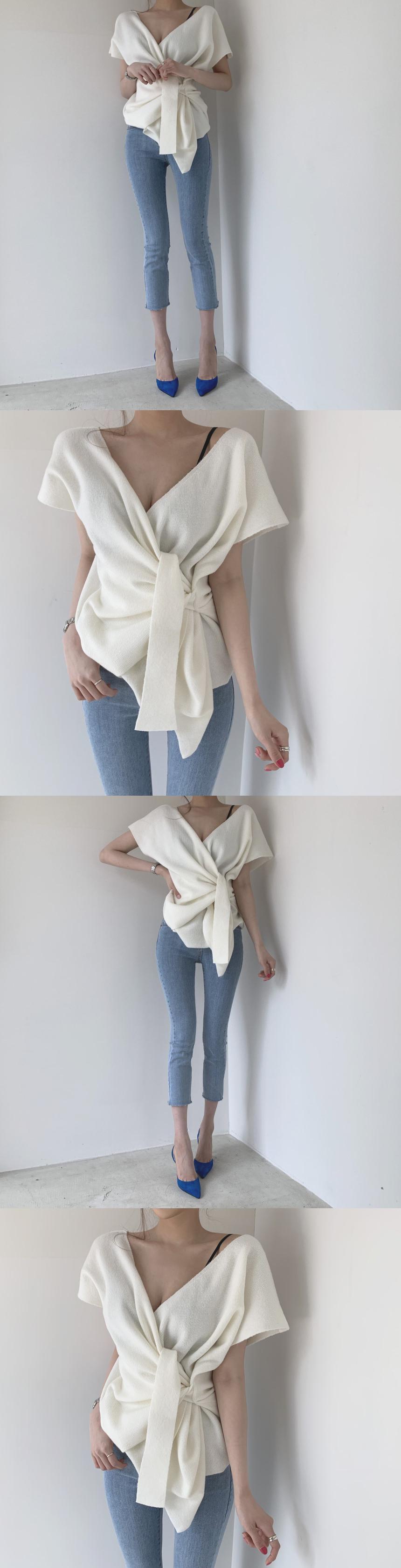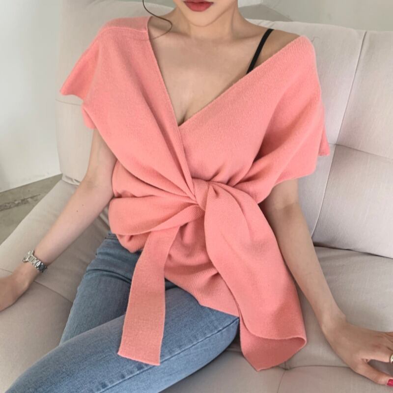 2020年春のシックなスリミングVネック丁寧なマシンフォールドネクタイデザインルーズ半袖セーターTシャツ女性 韓国婦人70192661306