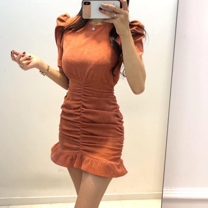 シックでエレガントなフェミニンなラウンドネックハイウエストプリーツスリムフィットコーデュロイフィッシュテールドレス 韓国婦人45709898059