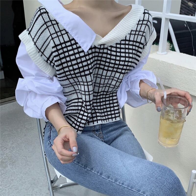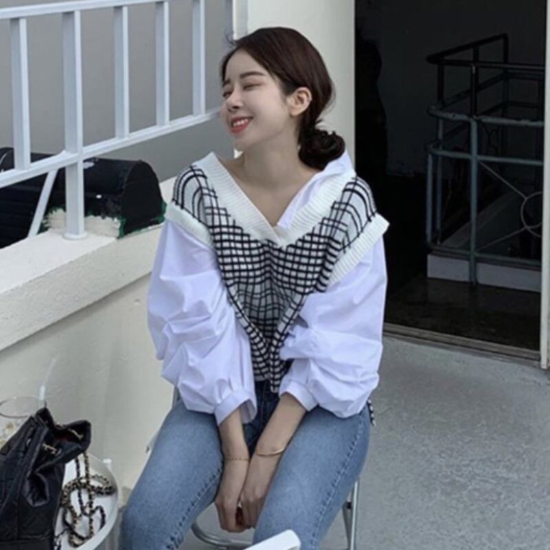 サウスイン秋ウエスタンスタイルオールマッチラペルステッチチェック柄デザインセンスのフェイク2枚ルーズパフスリーブシャツレディース 韓国婦人76733150247