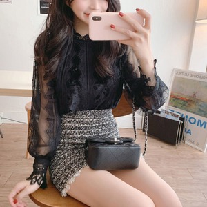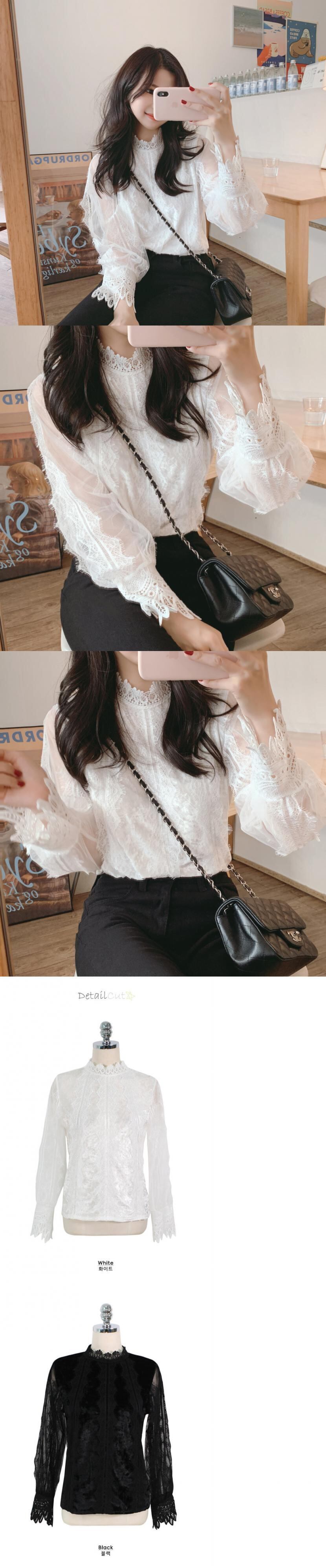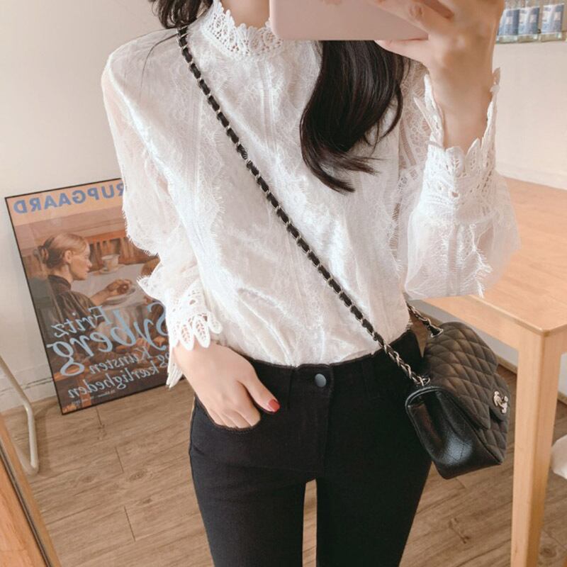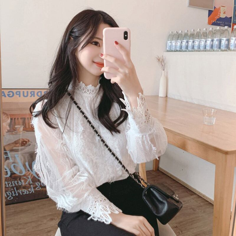 ホワイトレースシャツレディースゴールドベルベット長袖ハーフハイカラーボトミングシャツファッションエインスタイルトップス2020秋冬新作 韓国婦人89837598936