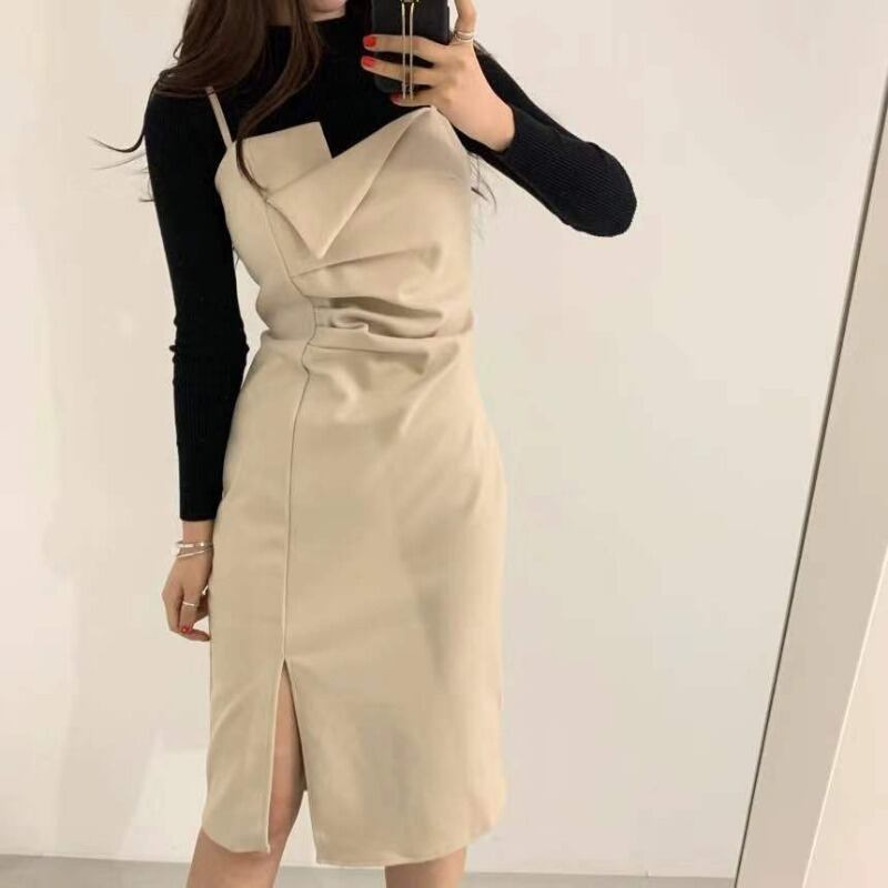 ins秋冬エレガントオールマッチ自家栽培インナーニットセーター+ウエストプリーツスリングドレス女性 韓国婦人70516302655