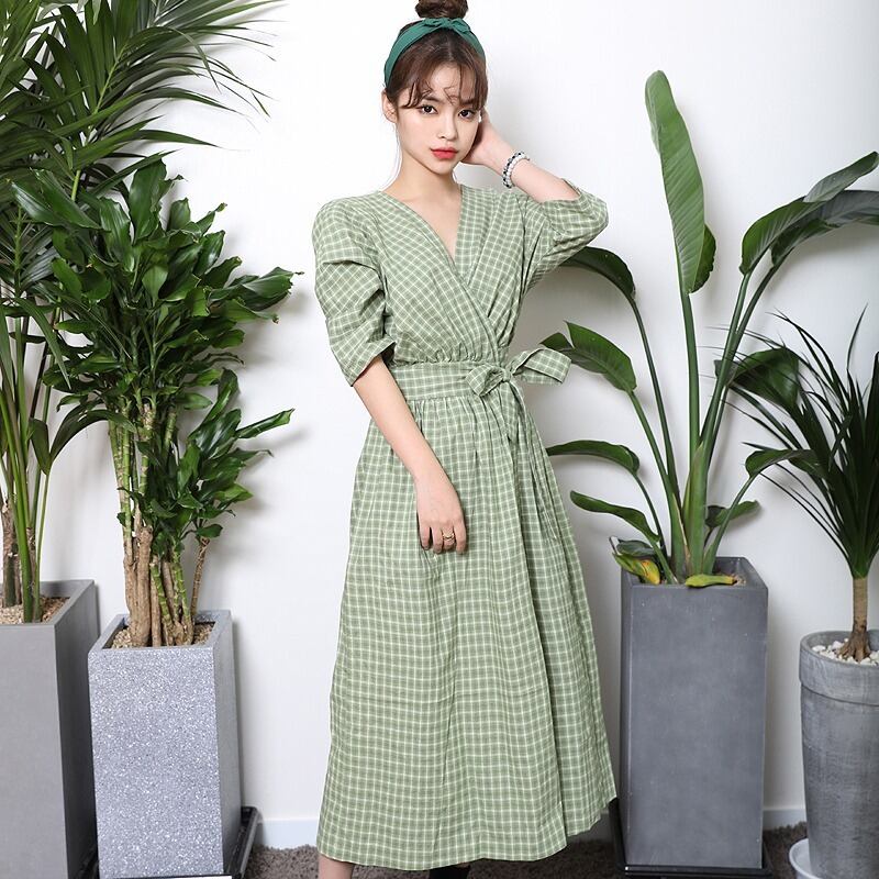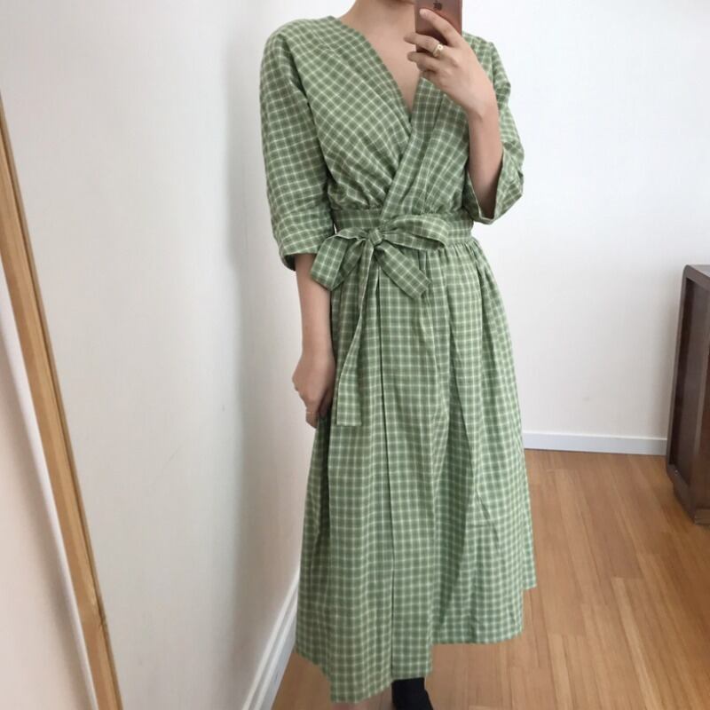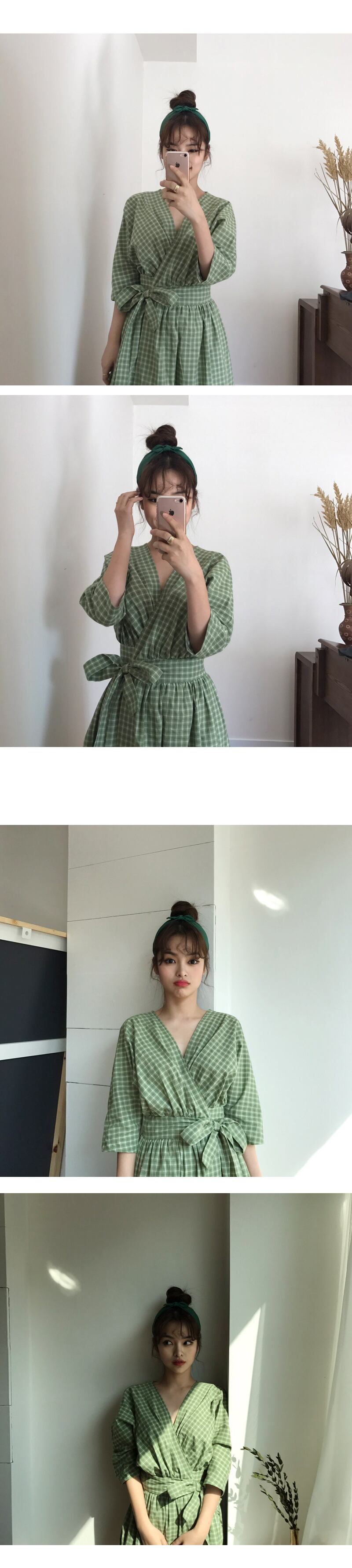 シックなレトロなミドル丈ドレスの2020バージョン、Vネックウエストチェック柄スカートハート新作 韓国婦人33419717815