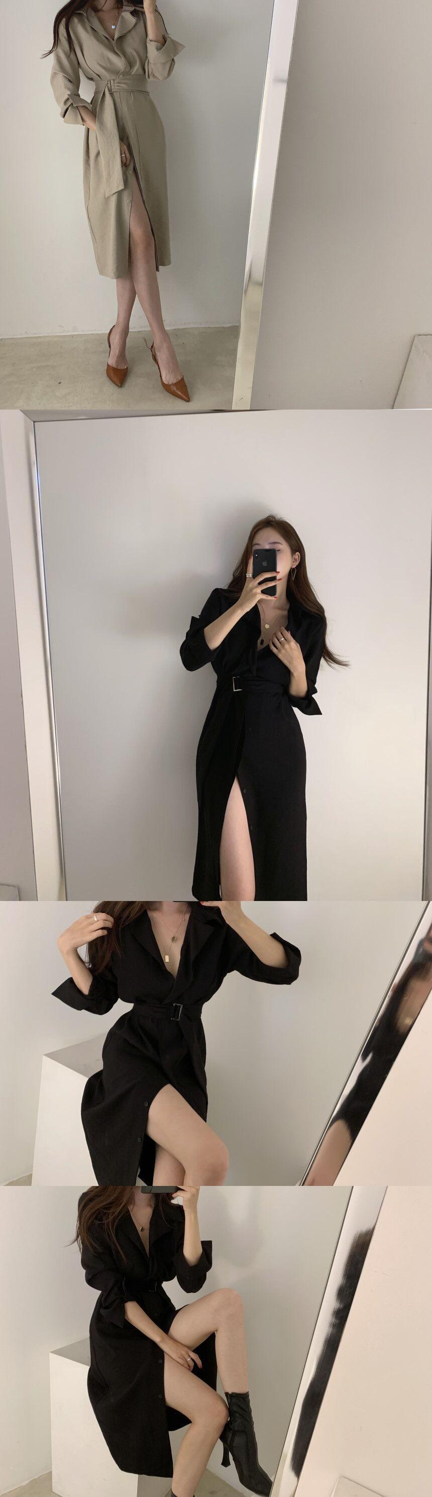 シックな早春の小さなセクシーなラペルシングルブレストベルトは薄くて長い膝上シャツドレスの女性でした 韓国婦人81647154456