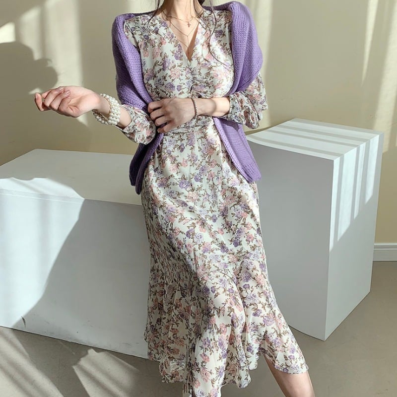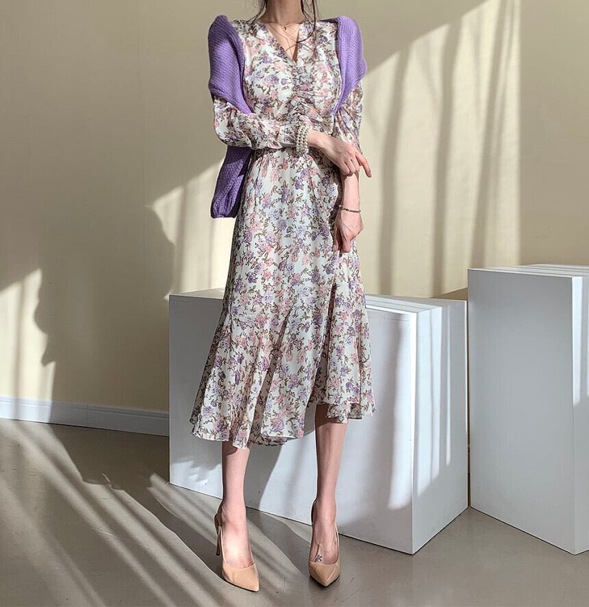 春夏新作シフォンフローラルドレスロングセクションウエストスリミング長袖フレンチレトロキキョウスカート女性 韓国婦人2801459178