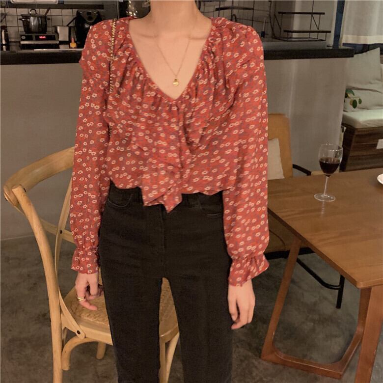 春夏シックなスウィートロータスリーフ間伐Vネックシフォンフローラルブラウスルーズ長袖シャツレディース 韓国婦人96087625081