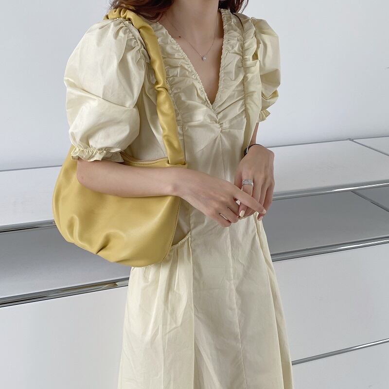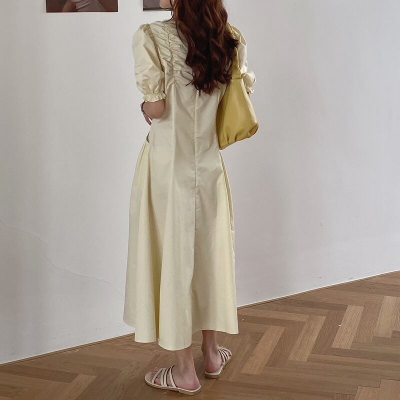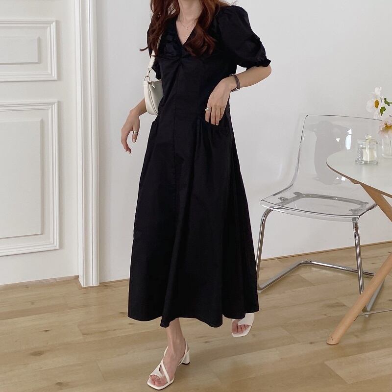 シックなフライドチキン優しくて細いVネックの折り目デザインウエストパフスリーブラージスイングドレスロングスカート女性 韓国婦人37513182555