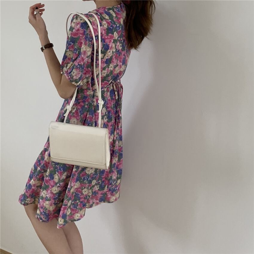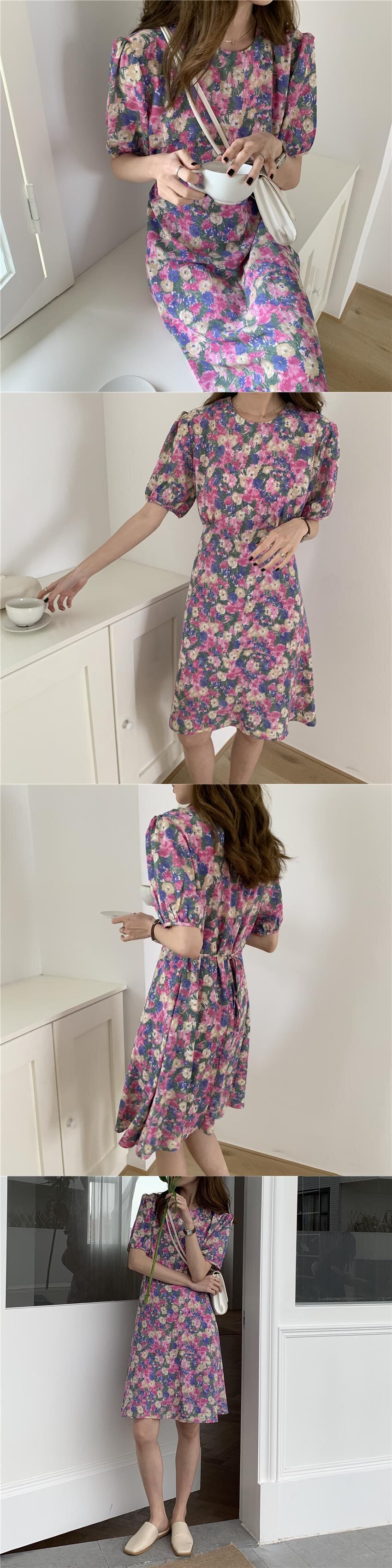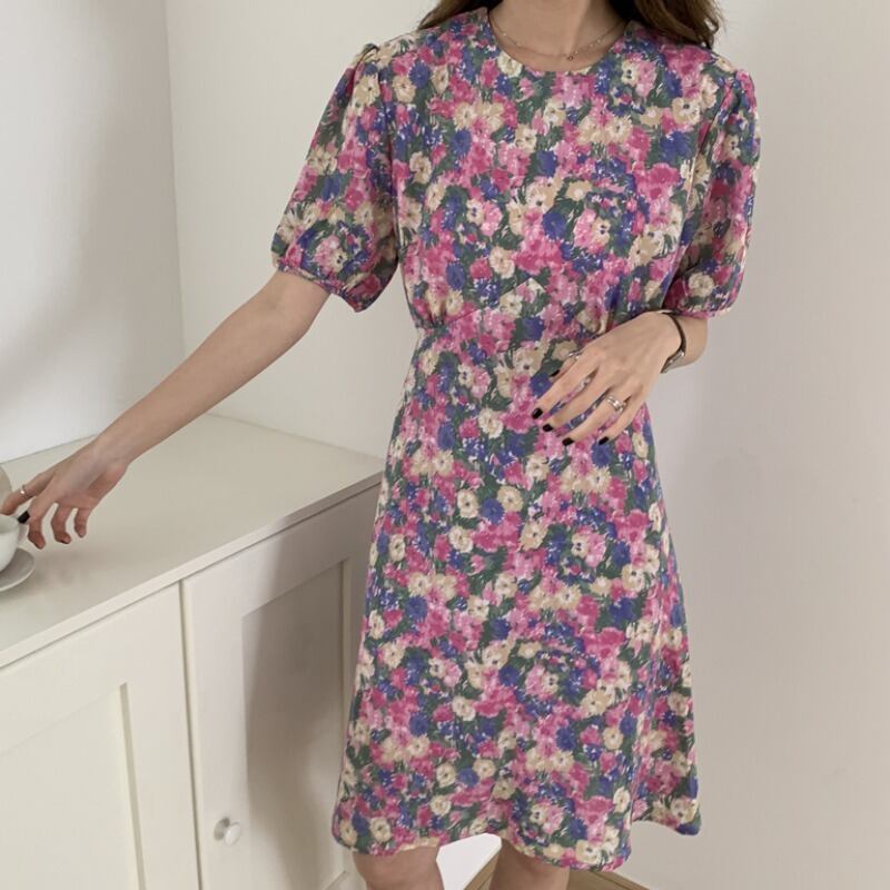シックなレトロなスーパーホワイトの油絵花柄のレースアップウエストは薄くて薄いパフスリーブドレス女性でした 韓国婦人30469948692