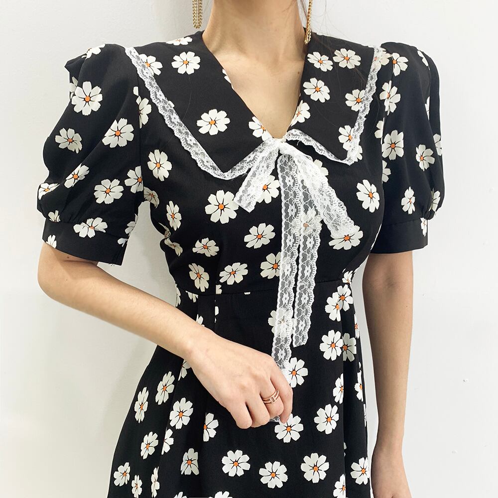 シックでエレガントなレースステッチ人形の襟小さなデイジーフローラルパフスリーブウエストドレス女性 韓国婦人12800160471