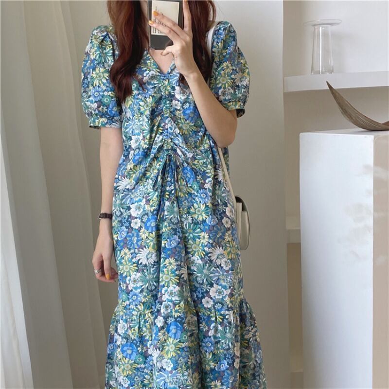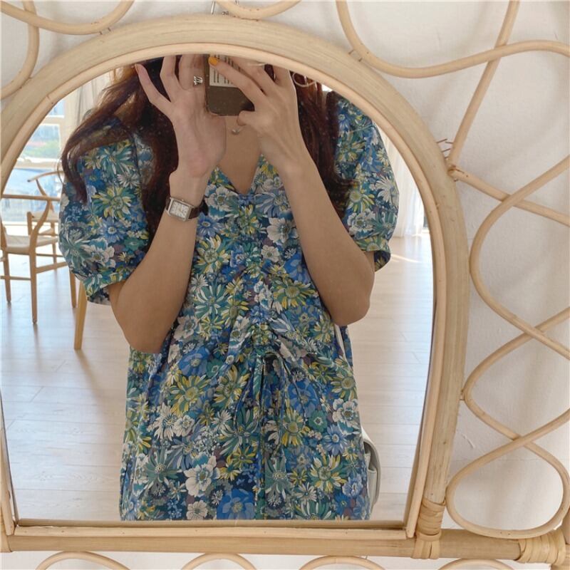 サウスインニッチ巾着デザインプリーツVネックサマーランタンスリーブルーズワイルドフローラルロータスリーフドレス 韓国婦人6279497546