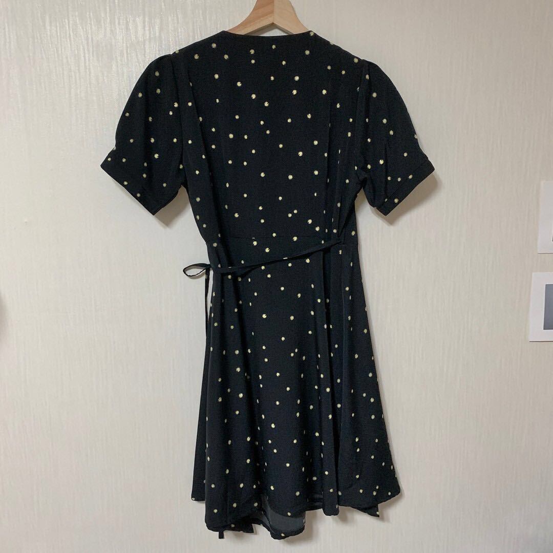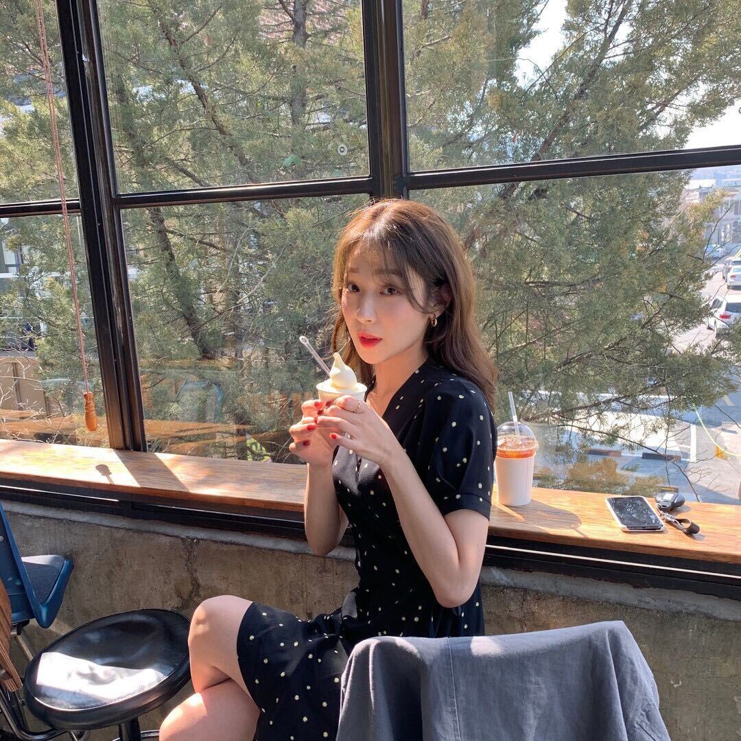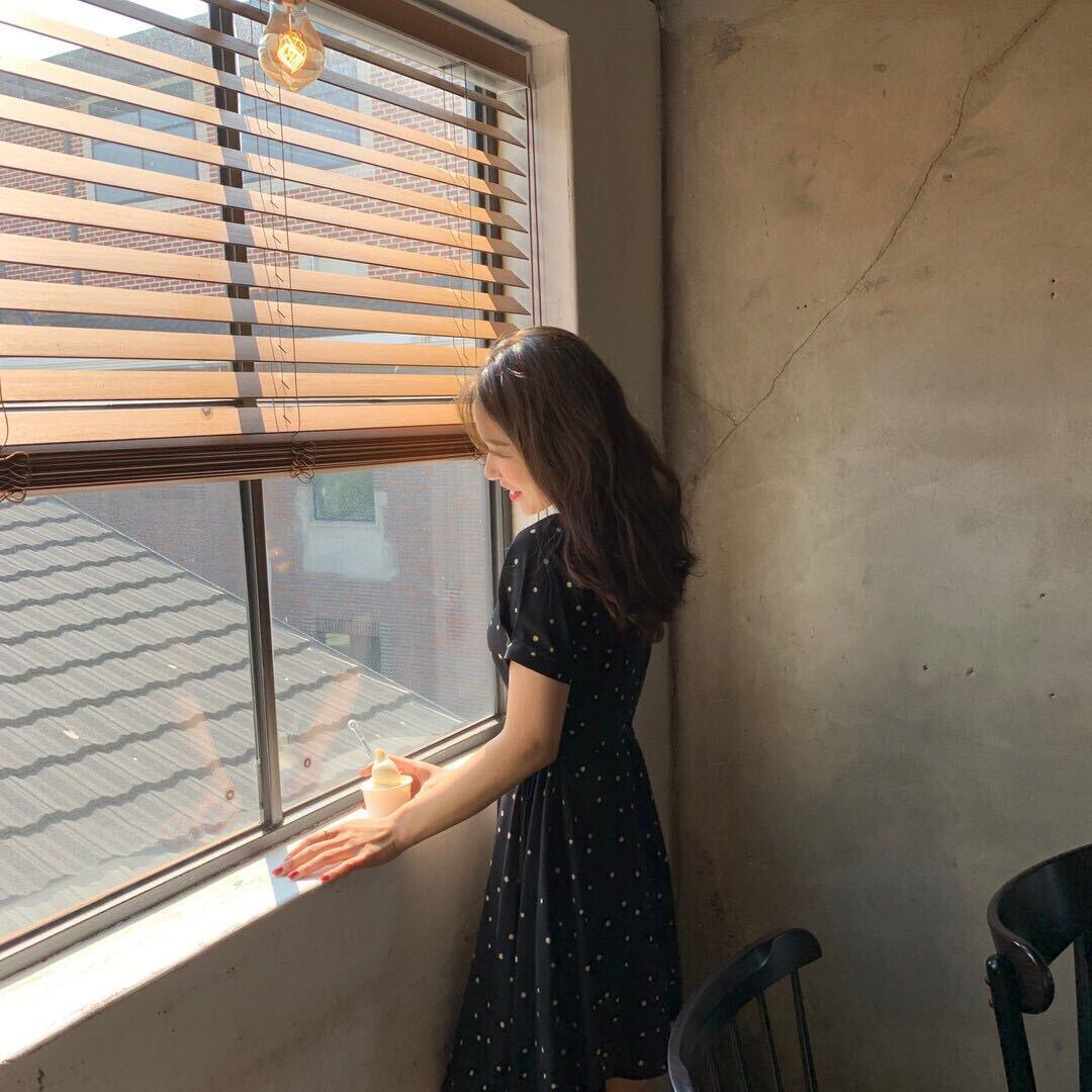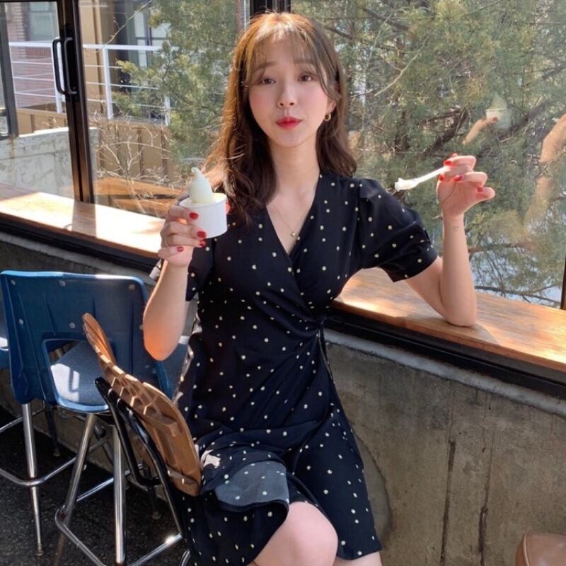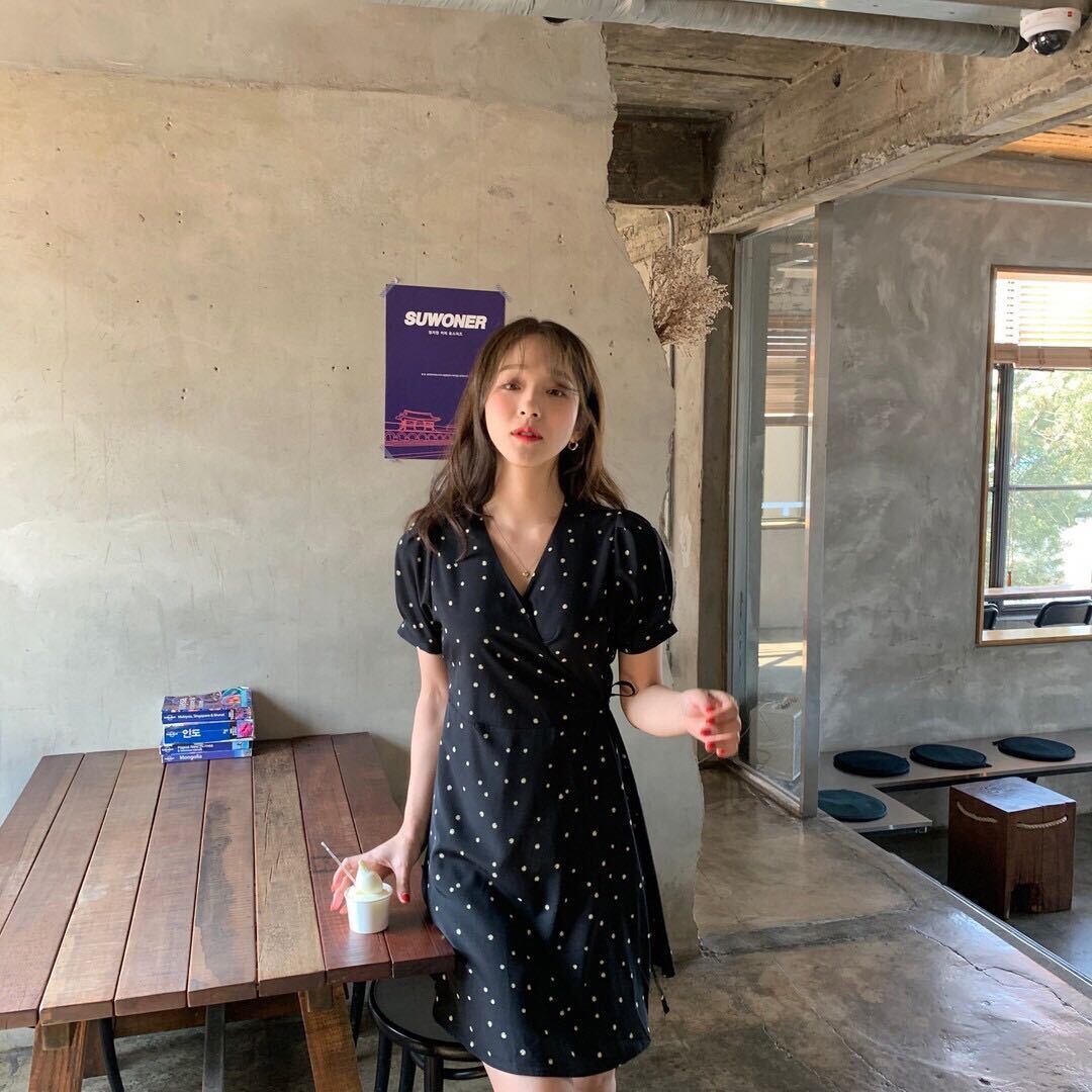 シックなウェーブポイントVネック細いサイドレースウエストパフスリーブワンピースドレスリトルブラックドレス 韓国婦人61798228711