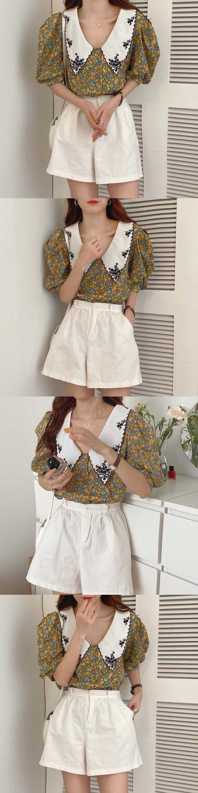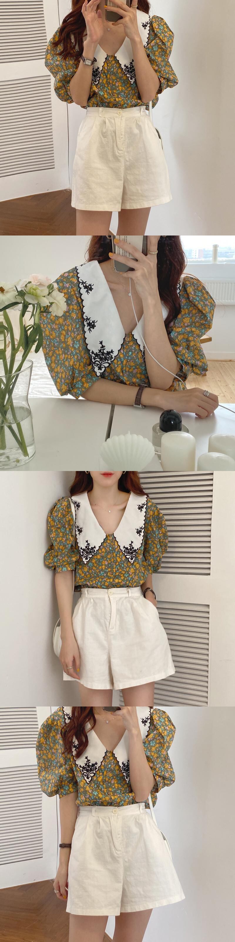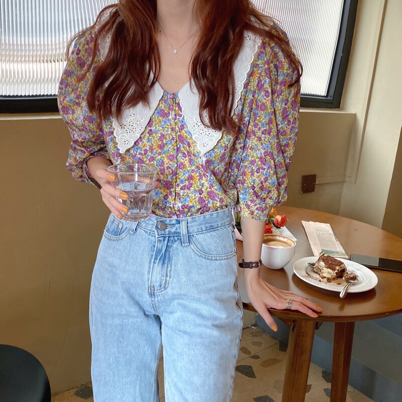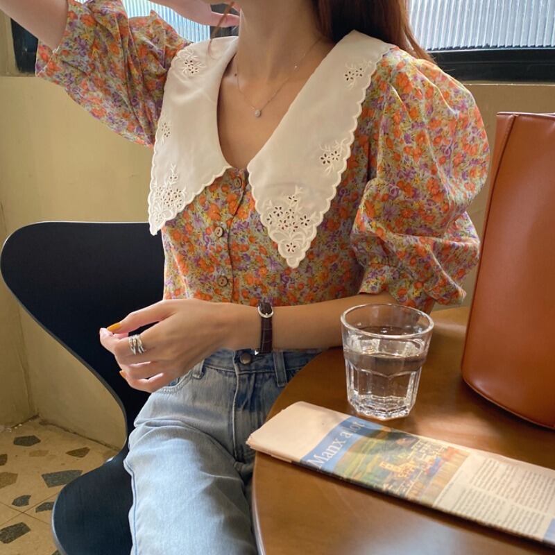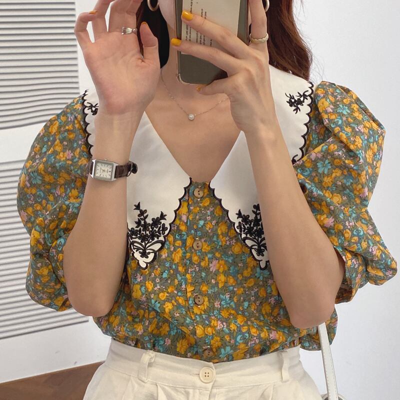 夏の新しいinsスーパーファイヤートップレトロフローラルシフォン刺繡シャツ襟半袖シャツ女性 韓国婦人6882939388