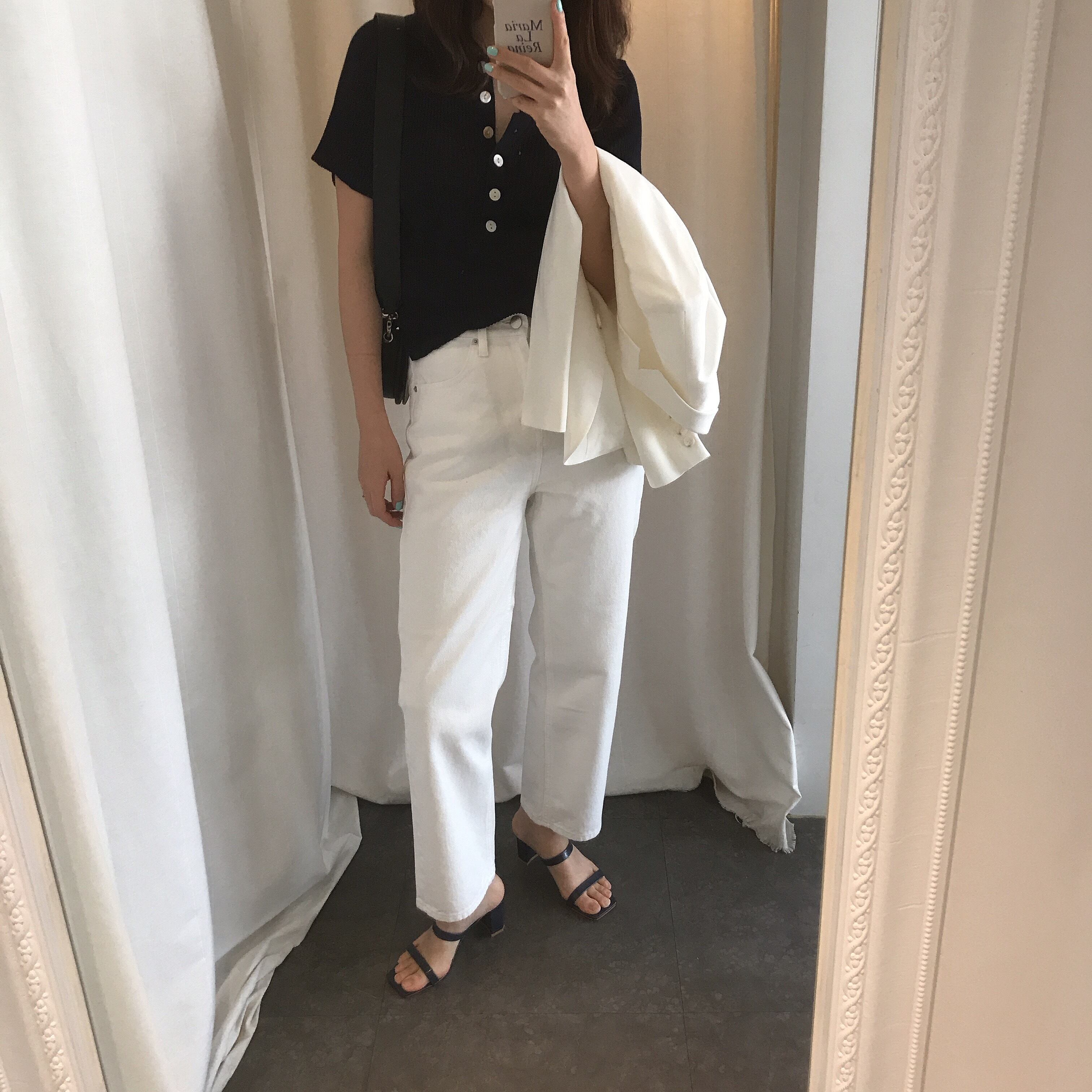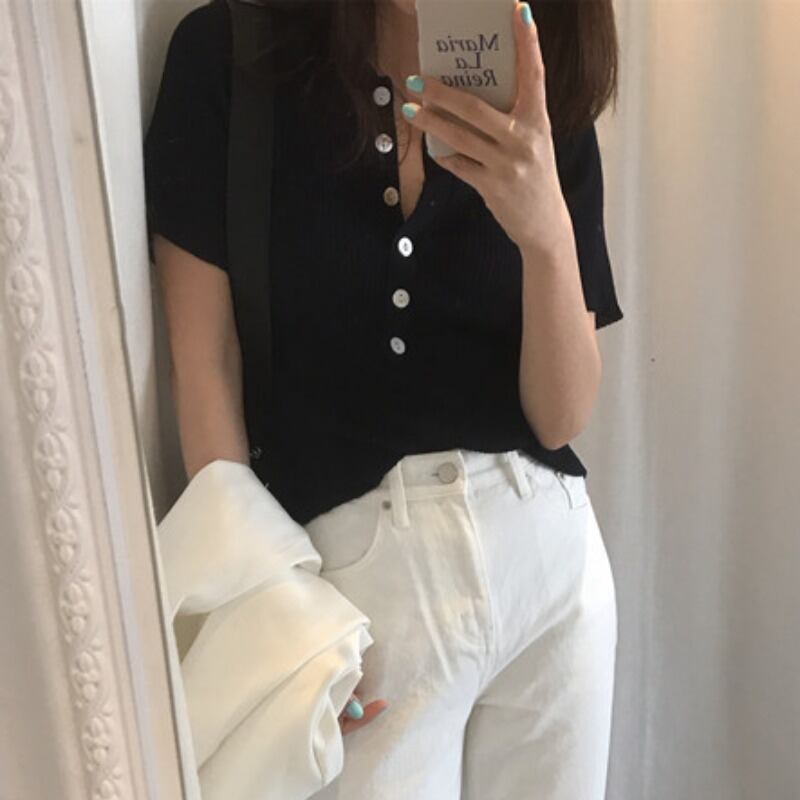 ins冷風超薄夏糸ラペルマルチボタンセーターシャツ半袖Tシャツ女性 韓国婦人48618351478