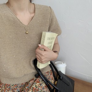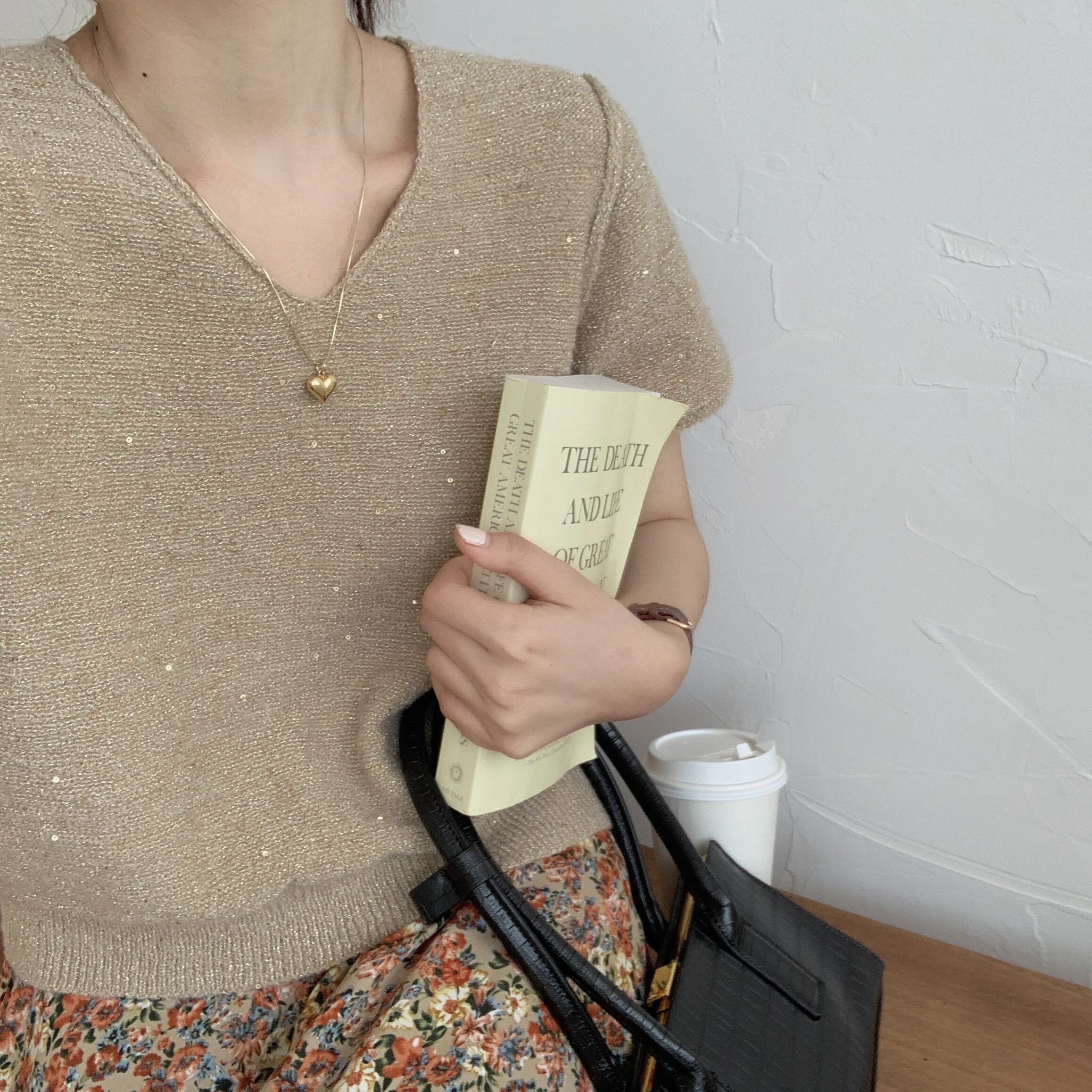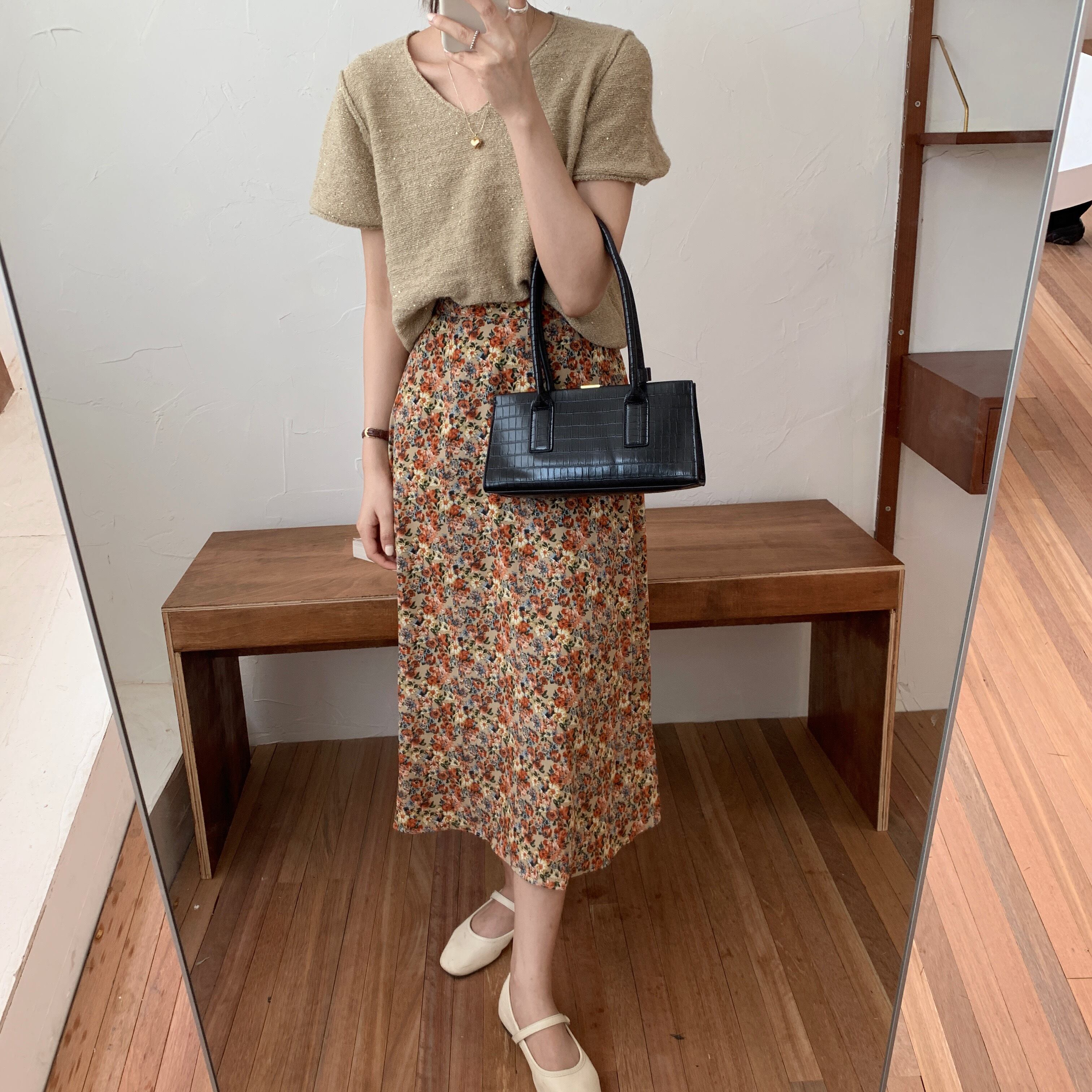 シックなレトロなVネックデザインのキラキラ半袖セーターTシャツ+ハイウエストシフォンフローラルスカートロングスカート 韓国婦人50655747985