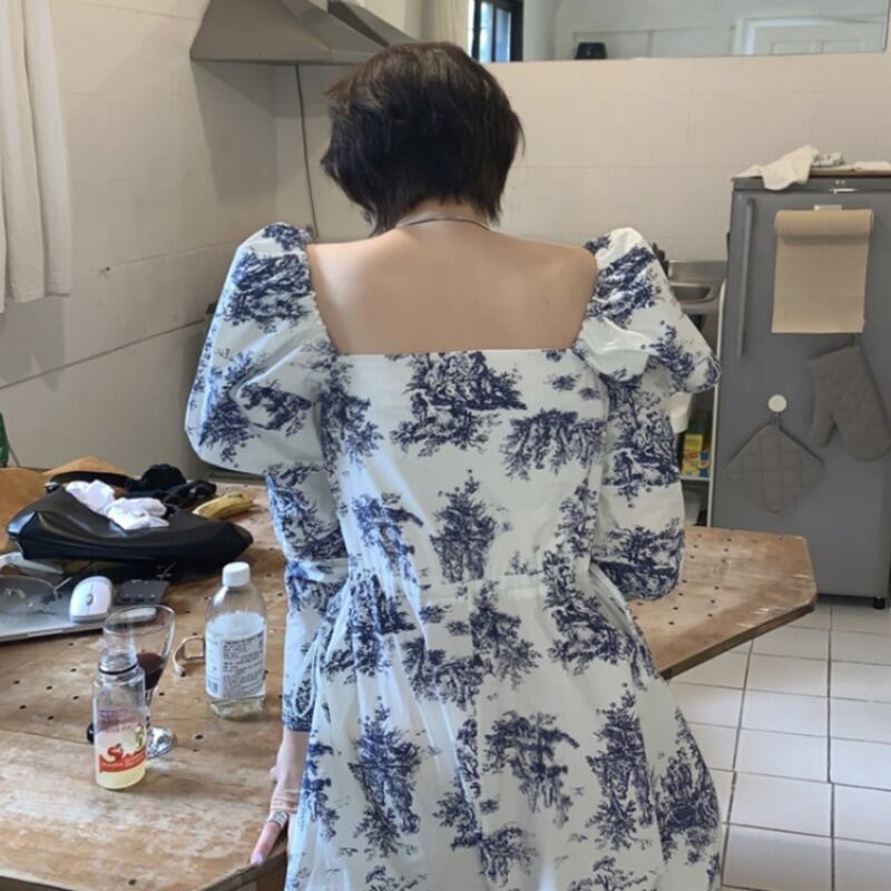 ins年齢を減らすレトロな印刷スクエアカラー漏れ鎖骨巾着デザインハイウエストロングパフスリーブドレス女性 韓国婦人65418736006