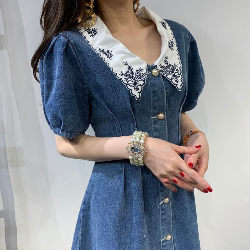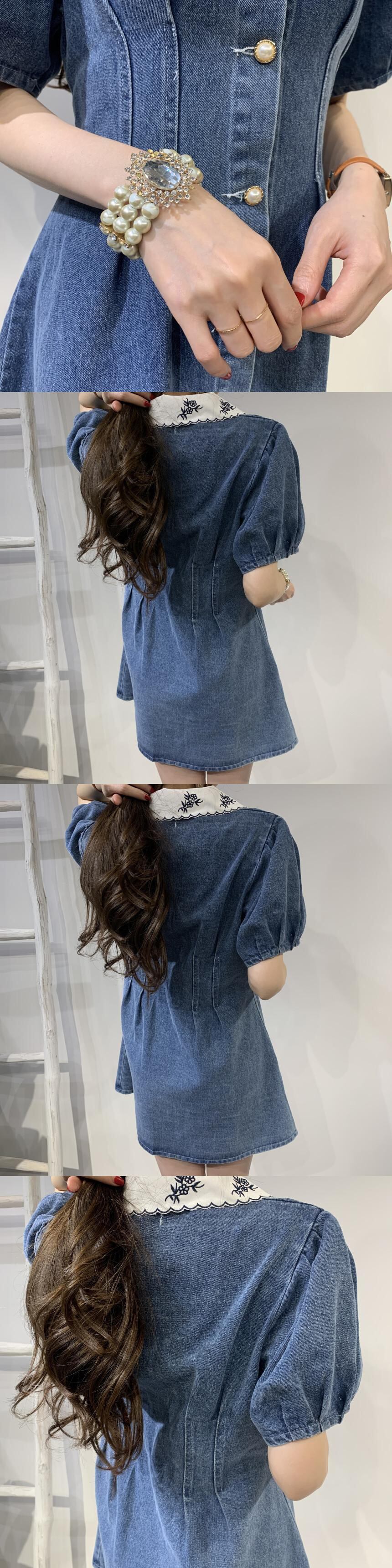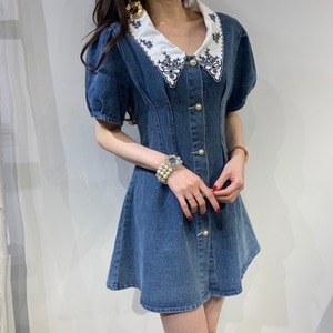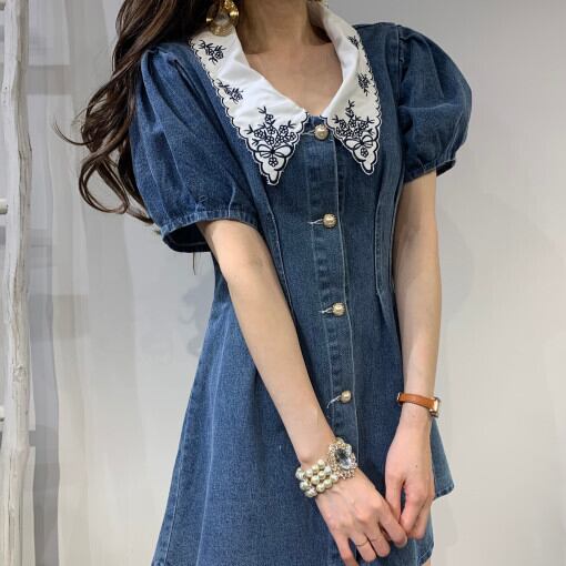 シックなニッチなレトロなラペル刺繍ステッチシックなボタンプリーツウエストパフスリーブデニムドレス 韓国婦人77130915659