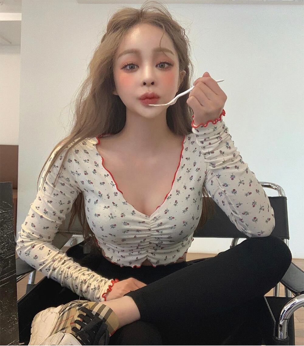 シックな春のワイルドレトロヒットカラーウェーブローVネックショートフォールドウエストスリム長袖Tシャツトップ 韓国婦人78580445645