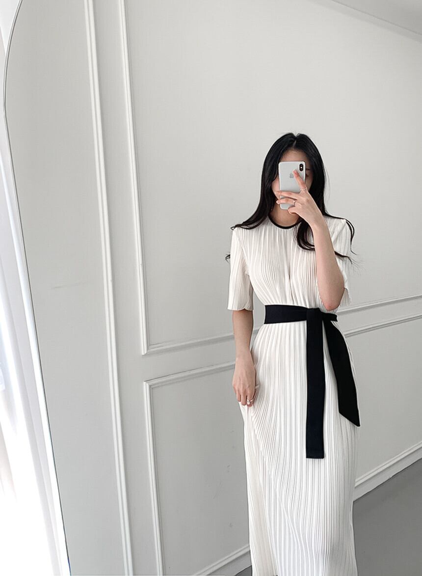 シックな気質エレガントなラウンドネック重工業の圧力プリーツデザインルーズタイウエストロングオーバーザニードレス女性 韓国婦人54978742862