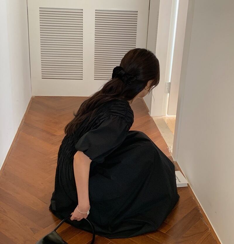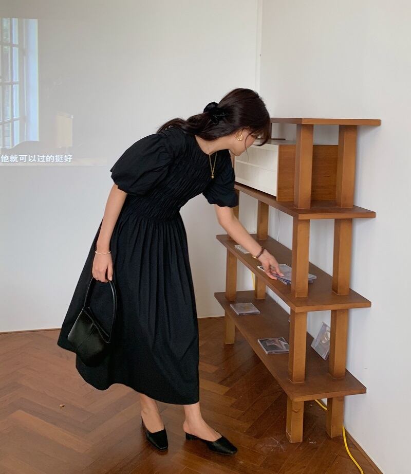 2020insレトロ気質バブルスリーブデザイン美しい脂っこいウエストと細い折り目ロングAラインスカートドレス 韓国婦人76763691289