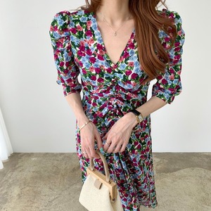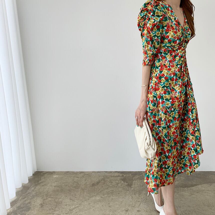 シックなスウィートとウエスタンスタイルの細いVネックドローストリングフォールドデザインウエストパフスリーブフローラルシフォンドレス 韓国婦人12288456239