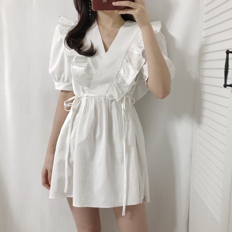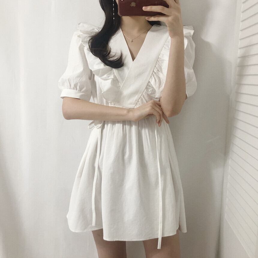 2020年春夏シックな甘い気質蓮の葉折り肩襟ウエストロリショートVネック白いドレス女性 韓国婦人40156844363