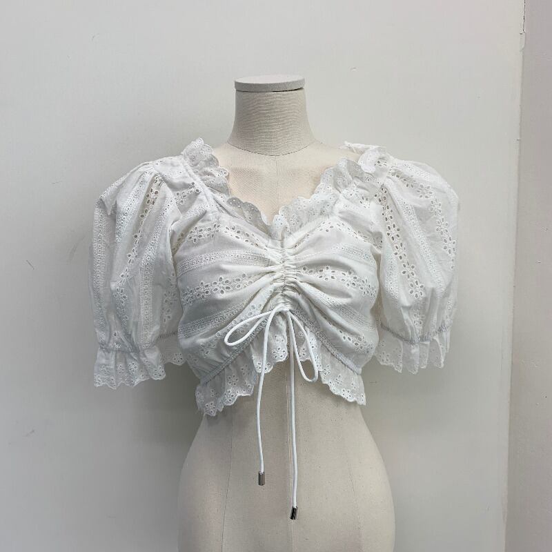 ins夏ワイルドエイジリダクション巾着菌Vネックパフスリーブショートジャケット中空半袖シャツメス 韓国婦人47395262422