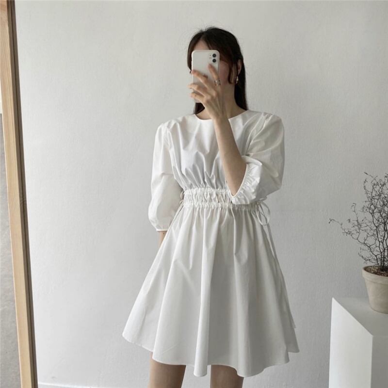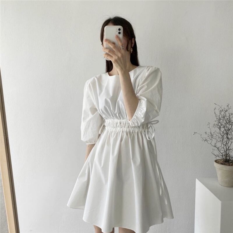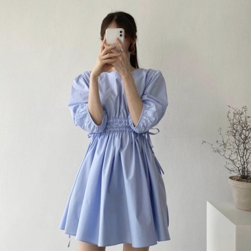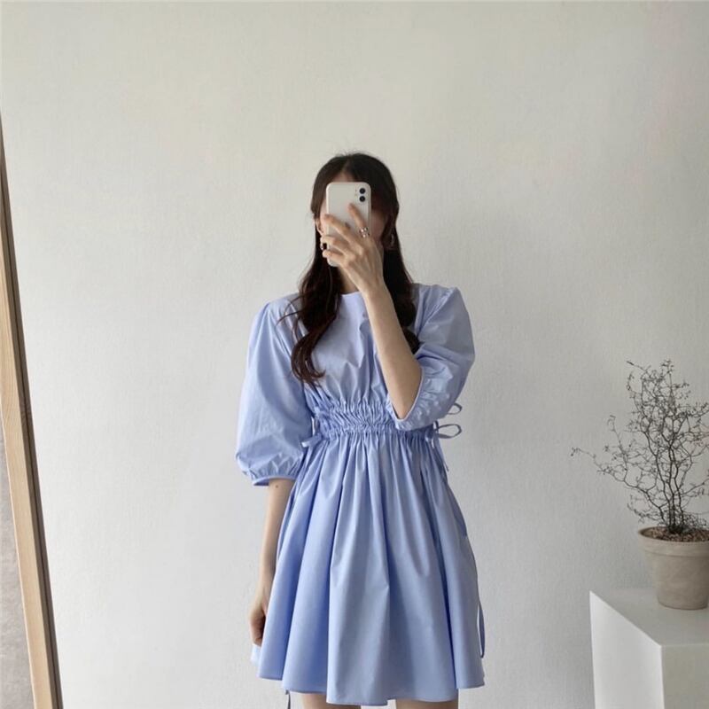 シックなエインスタイルワイルドラウンドネックウエストドローストリングデザインルーズパフスリーブスモールドレスショートスカート 韓国婦人94391760374