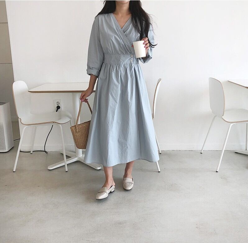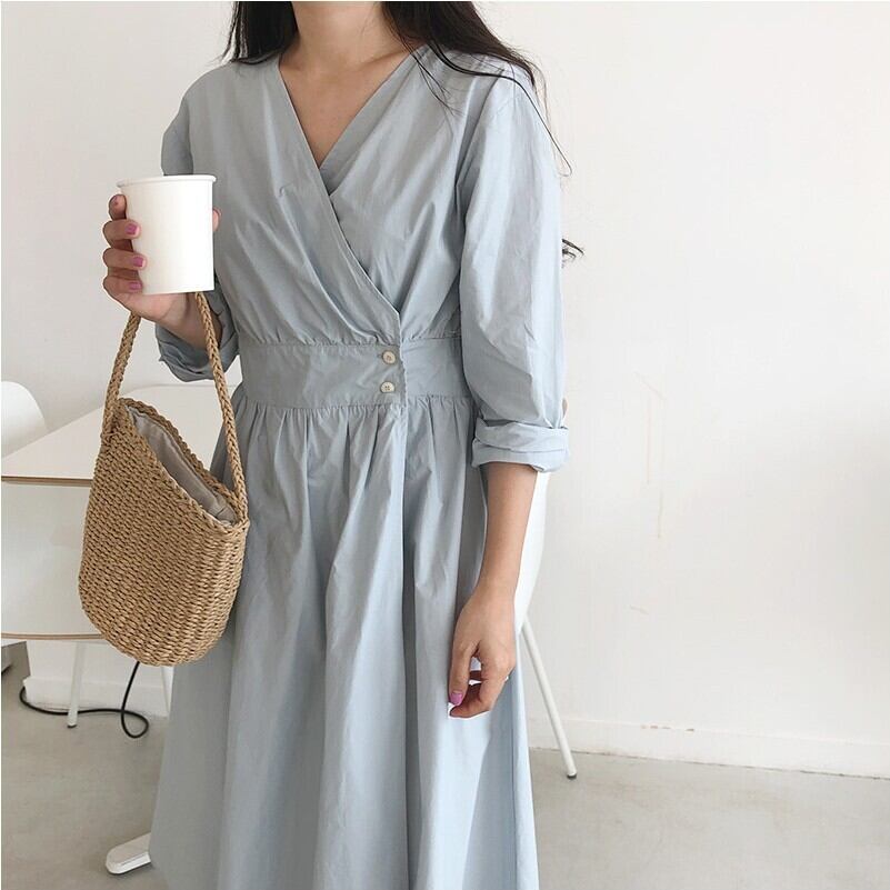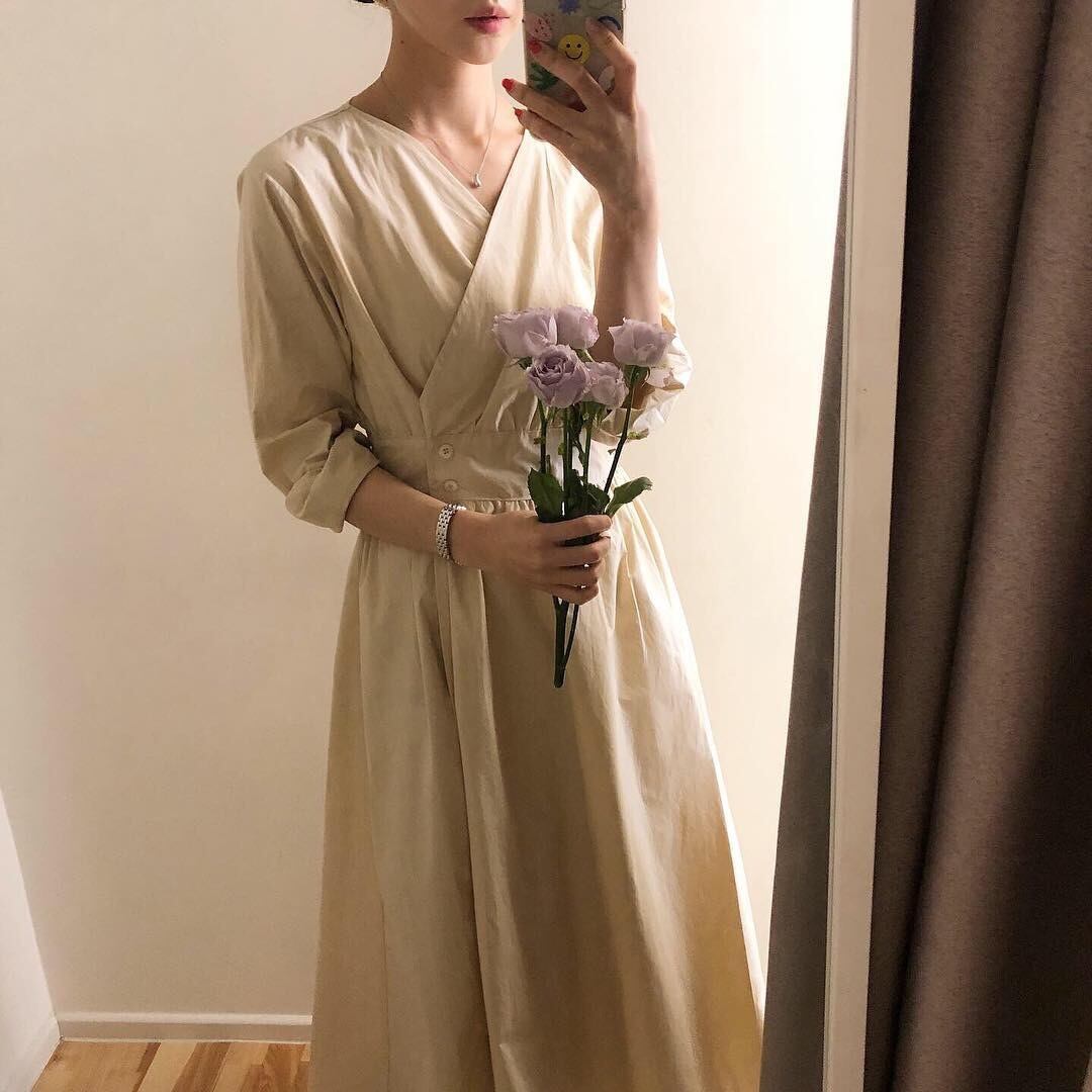 インデザインワンピース調節可能なレトロ怠惰なウエストクロス斜めバックルVネックスリムドレス女性 韓国婦人6221775601
