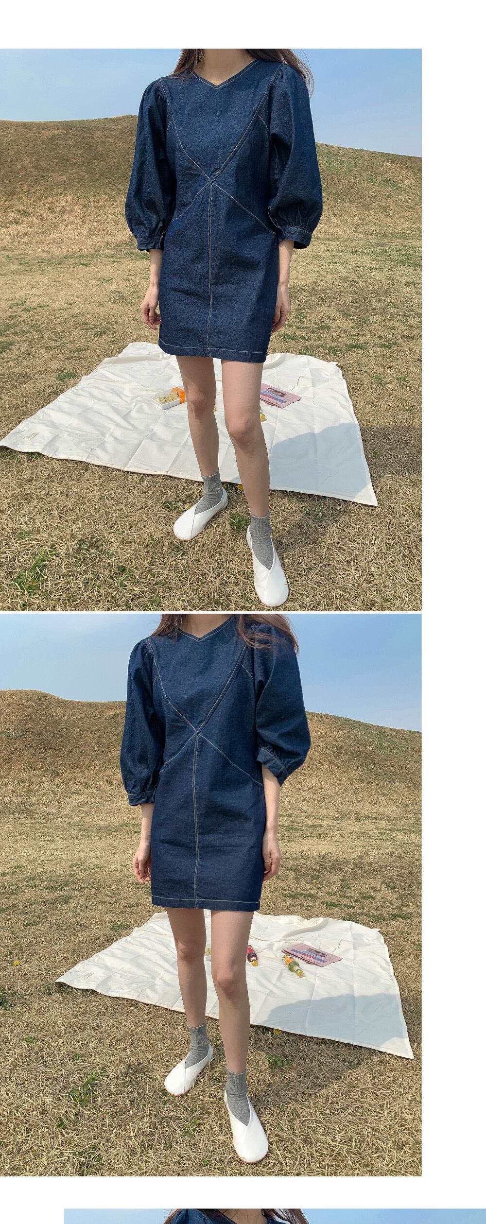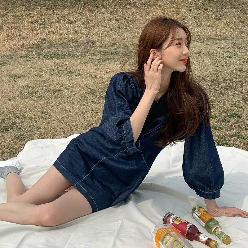 insスウィートレディ初夏ウエスタンスタイル7点バブルスリーブVネックオープンラインデコレーションデニムブルードレス女性 韓国婦人34972263077