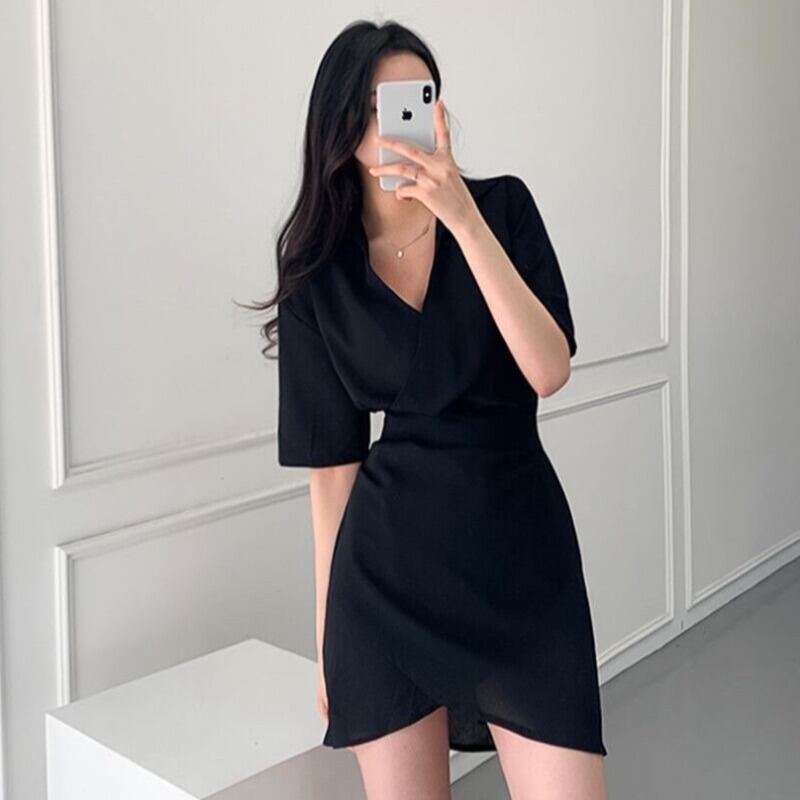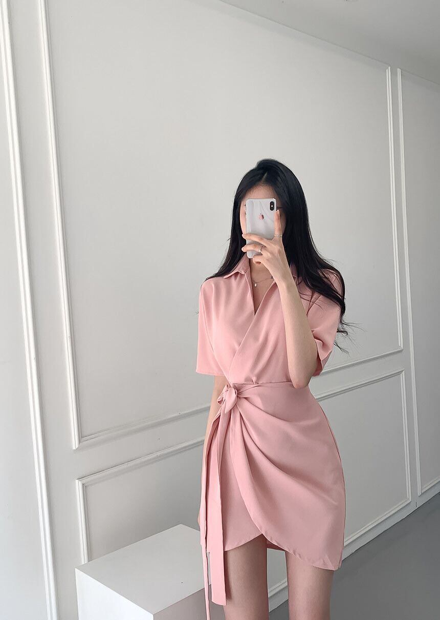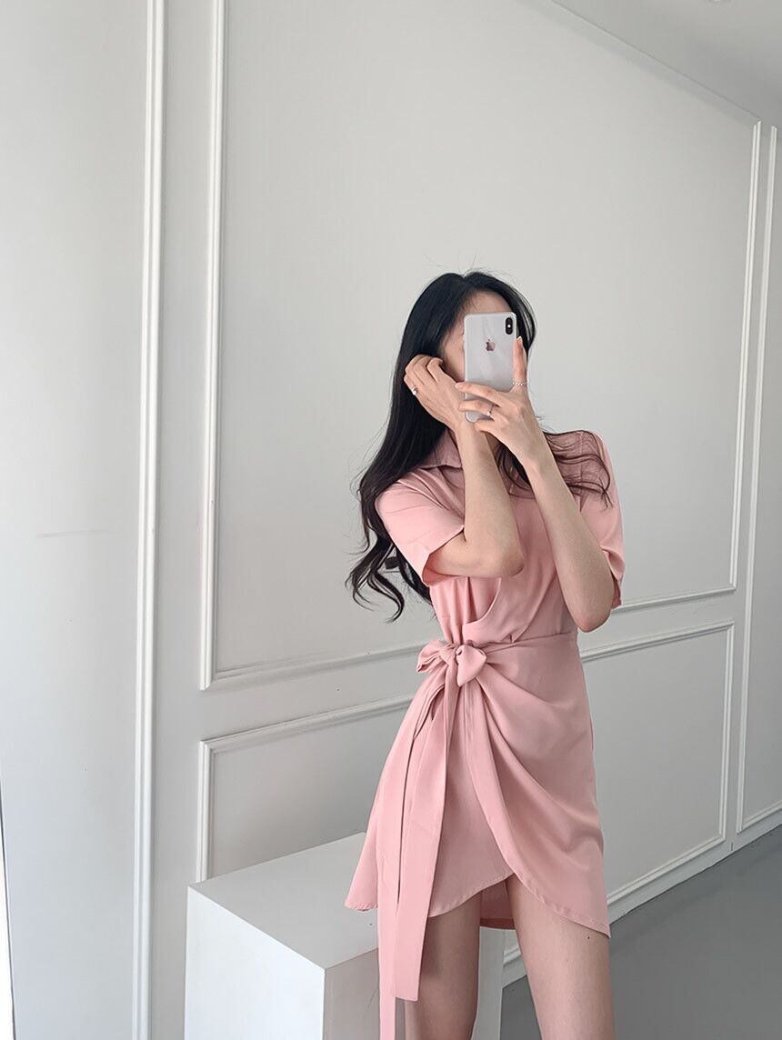 シックでエレガント、軽い、成熟した、薄い、襟のネクタイ、蝶ネクタイ、ウエストの不規則なドレス、短いスカート、女性 韓国婦人23493012572