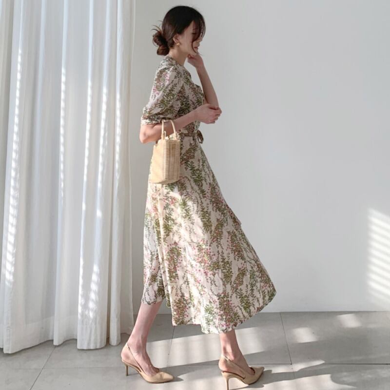 Vネックフローラルミドル丈スカート2020夏新作スタイルエレガントレースアップウエストスリムプリントワンピース 韓国婦人2544456845
